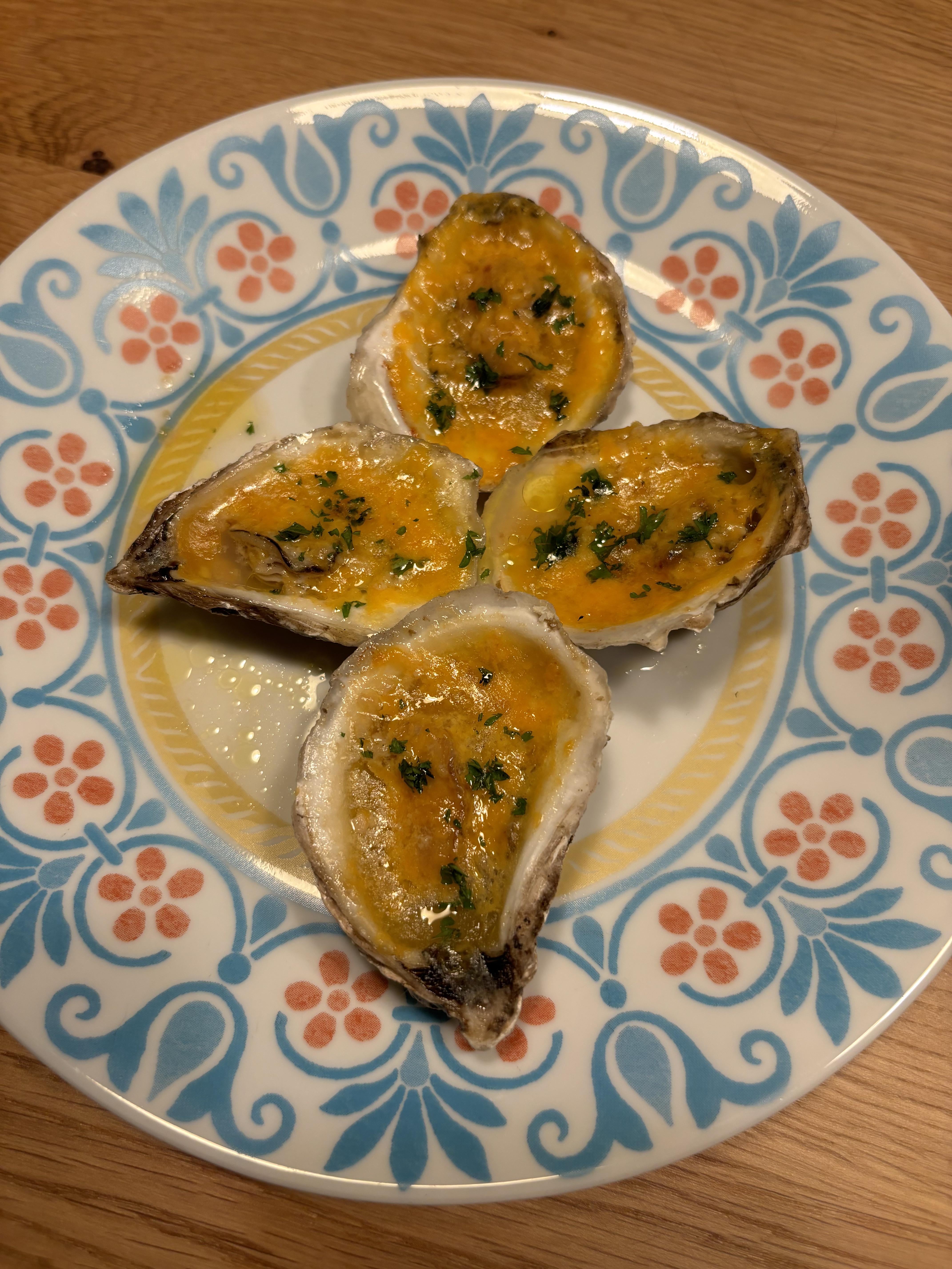 Did some beautiful Irish Point oysters in the oven, left the brine in shell for more flavour. Put some homemade garlic butter with lemon juice in them, then broiled for about 2 minutes with cheese. Served with fresh parsley, Bon Appétit!