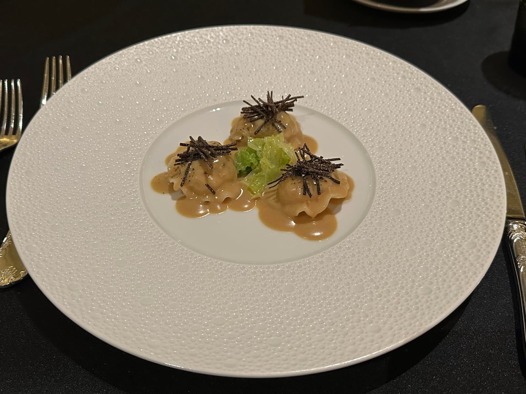 La Langoustine (+$40): Prawn in a truffled ravioli with green cabbage