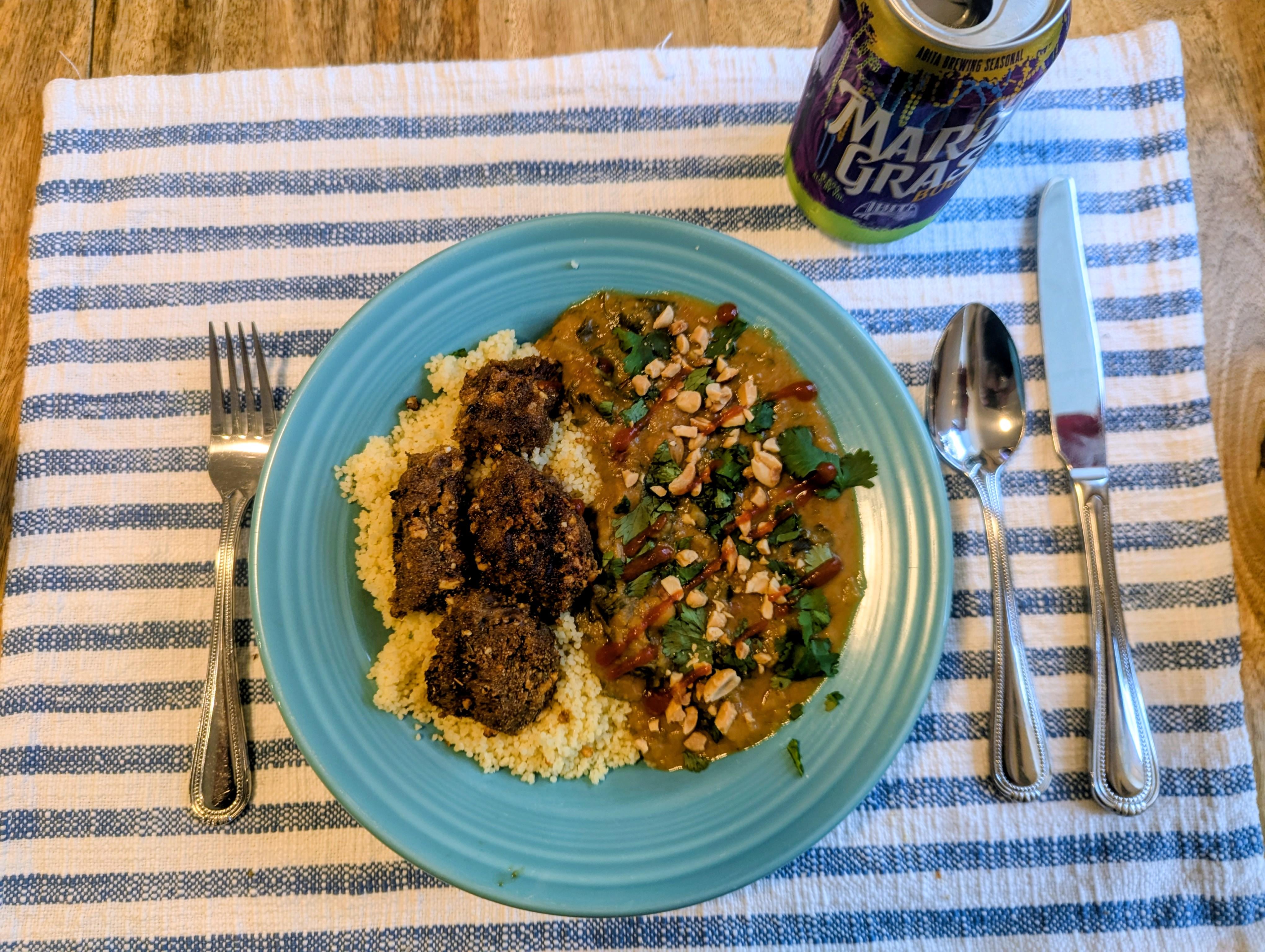 Went rooting around in the freezer and came across some West African peanut stew and a ribeye, so I reheated the stew and whipped up some Nigerian spicy beef skewers (suya) 🔥
