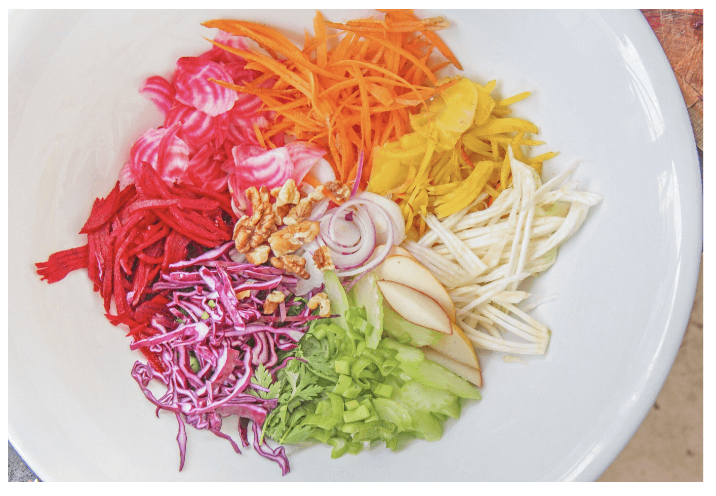 1. Shred the red cabbage, and finely chop the red onion and celery. With a julienne peeler, make matchsticks from the beetroots, carrot and celeriac – or use an ordinary peeler to make fine shavings. Cut the pear into wedges.
