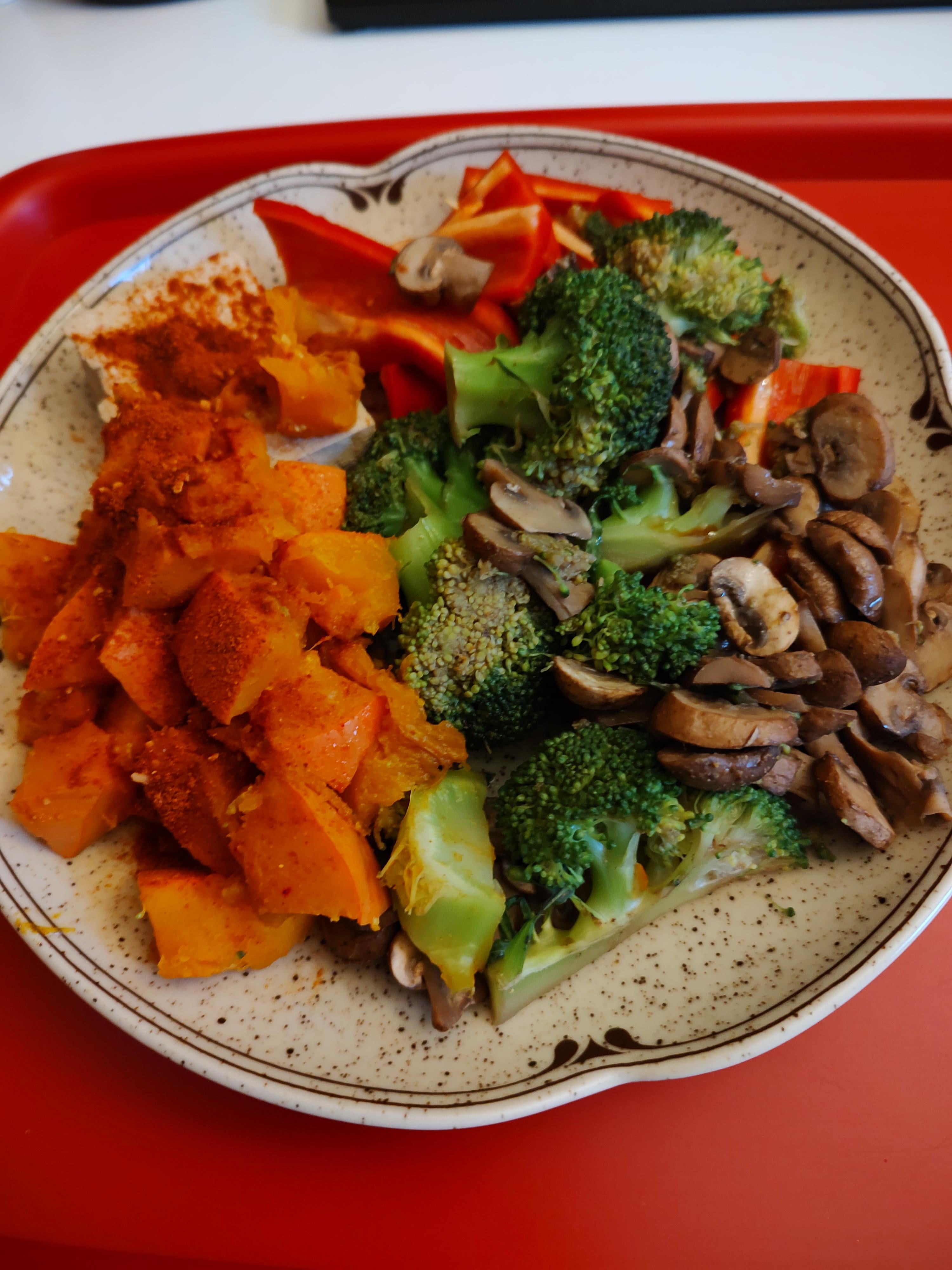 Pumpkin, broccoli, mushrooms, tofu and bell.pepper. The red stuff is tandoori spice mix. It was plentiful and delicious and powered me through my workout 😋 by ArmadilloChance3778 Vegan Food Vegan Food Porn