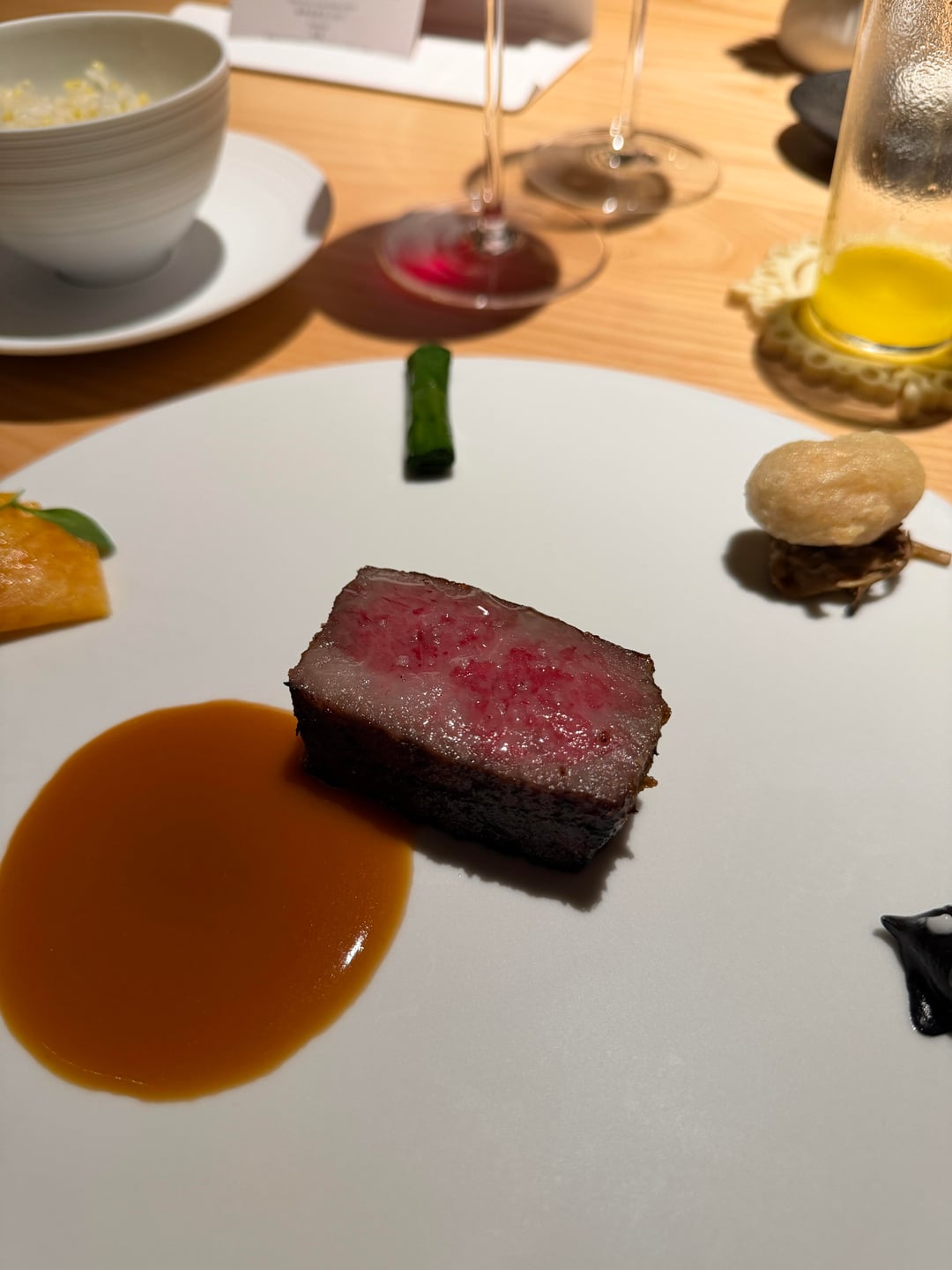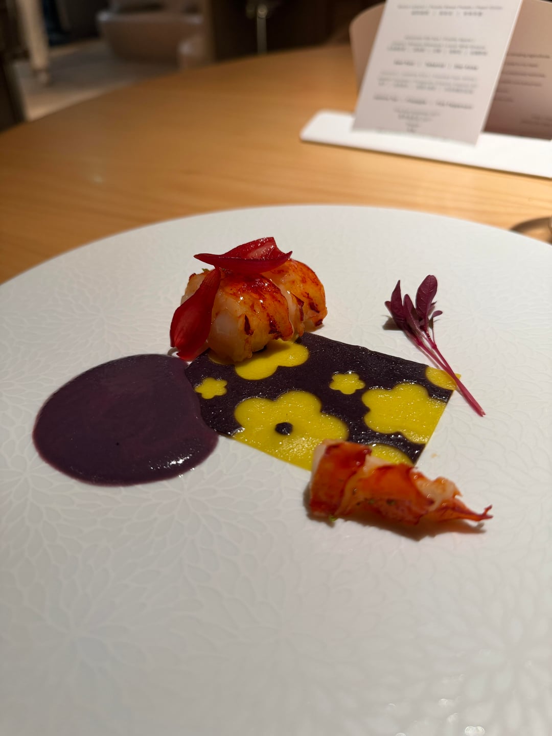 6. Maine lobster, served with noodles in the middle and a sauce, both made out of purple sweet potatoes from Taiwan. I think this was unfortunately the weakest link among the courses. There was nothing wrong with the execution, but at the same time, nothing unique about it either. Tasty, nonetheless.