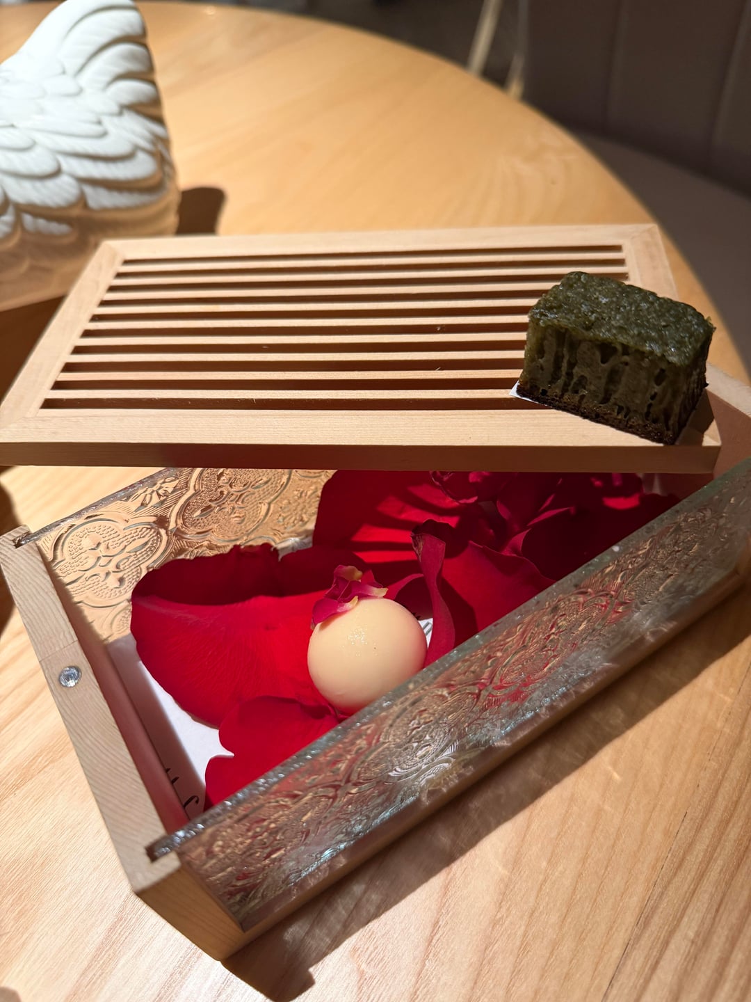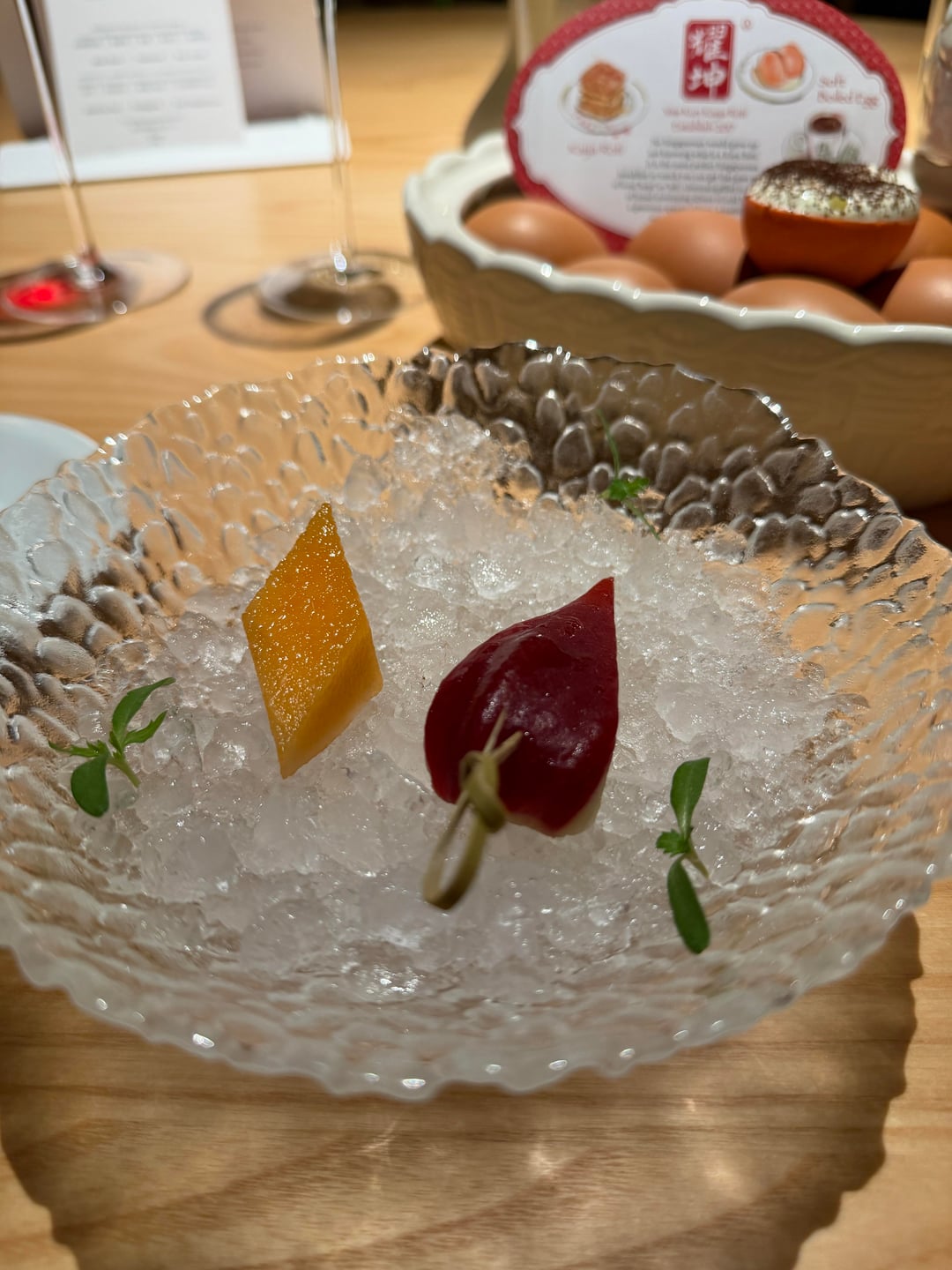 9. A set of sweets, with their signature dessert, Yawkun Kopitiam. First of all, I was almost mesmerized by the fact that they made a fully edible one bite dish, including the eggshell. So much so that I forgot to take a photo of its cute presentation, a pottery chicken containing multiple eggs. You were supposed to pick up the cracked egg and put it in your mouth, including the eggshell. I think it is a prime example of a familiar taste done extremely well. Coconut, butter, coffee, cream, and bread all there in one bite was great to have. Again, I like when chefs try something deconstructive when I can grasp the clear purpose of it. The other pieces were white chocolate filled with rose water, sponge cake made out of an Indonesian vegetable, and local seasonal fruits. They were good, but there was a clear star among the group, and unfortunately, they felt more like side pieces.