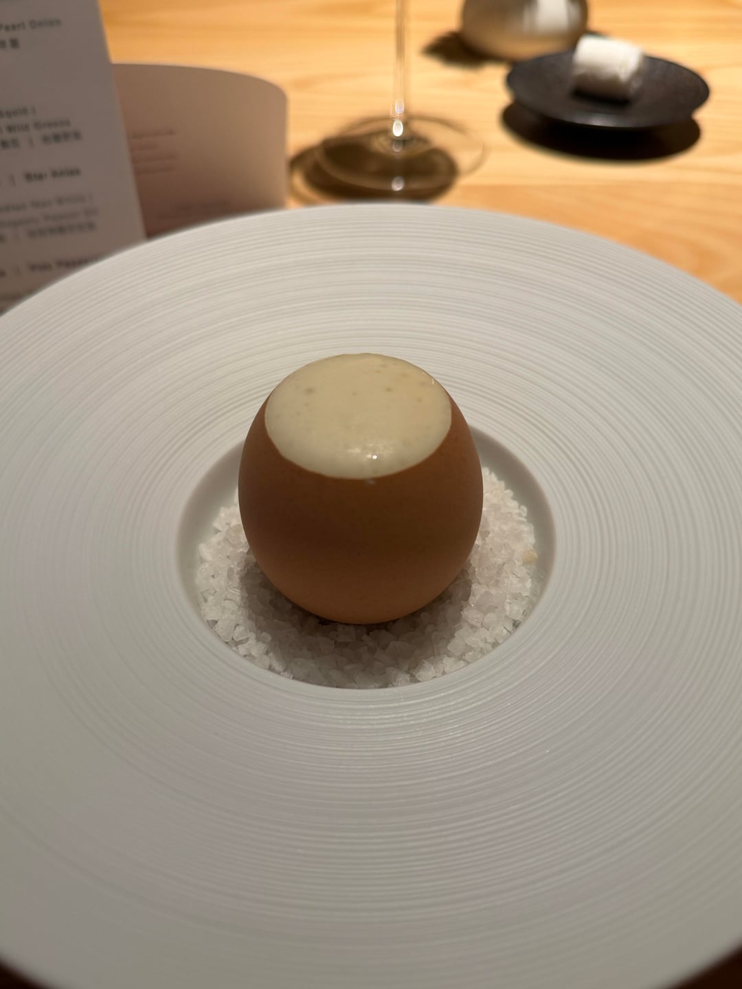 3. Reimagination of a Taiwanese and Singaporean omelette: egg foam served inside the eggshell, with Gillardeau oysters, sea grapes, and tapioca gel inside. The most noticeable aspect of the dish, in my opinion, was that it contained several different textures from each ingredient, evolving from the literal melting/quick dissolving of the cream to the crunchiness of the fresh greens. The bounciness and chewiness at different levels were provided by the oyster meat, sea grapes, and tapioca jelly. So, one could say the texture had its own evolution, going from soft to firm and crunchy, as it seemed to me. Flavor wise, the sea grapes and oysters offered quite an oceanic feel to it, and it paired up great with the egg foam. After all, eggs and seafood are a time-tested combo, even for a Korean person like me (case in point, 해물파전 or 계란찜).