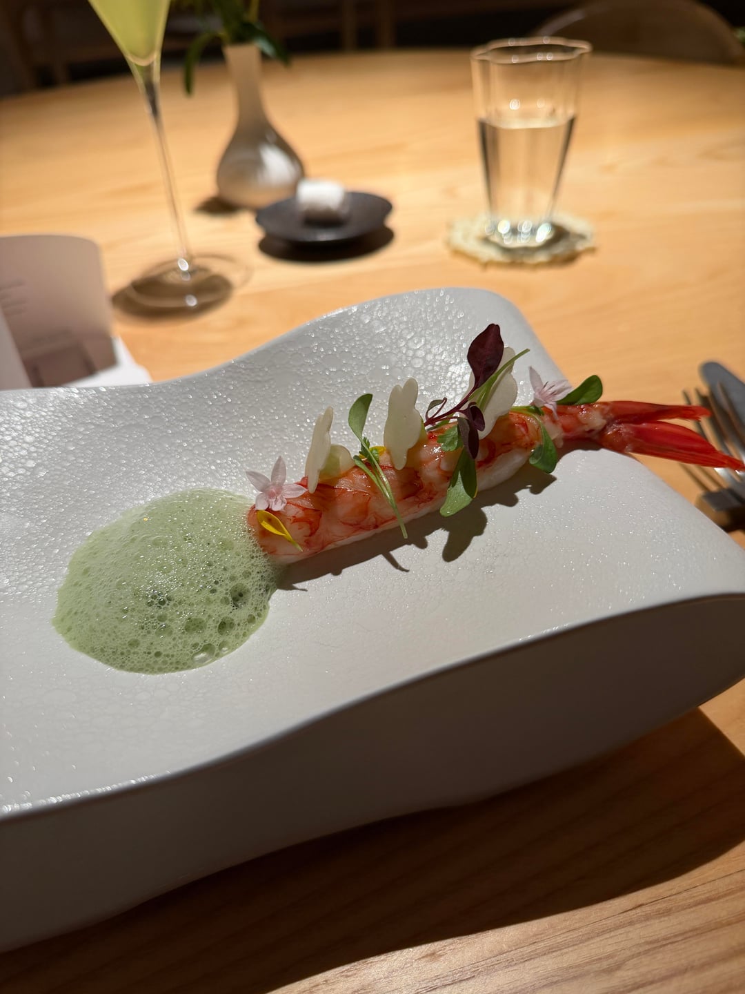 2. Something not written on the menu, “red shrimp,” served with a foam made out of a Chinese green, whose name I misheard, and a black sauce that reminded me of the one usually served with Peking duck under the foam. Also, a bit of refreshment was added on top of the meat, placed carefully so that you could cut the shrimp into pieces with the sauce and without it.