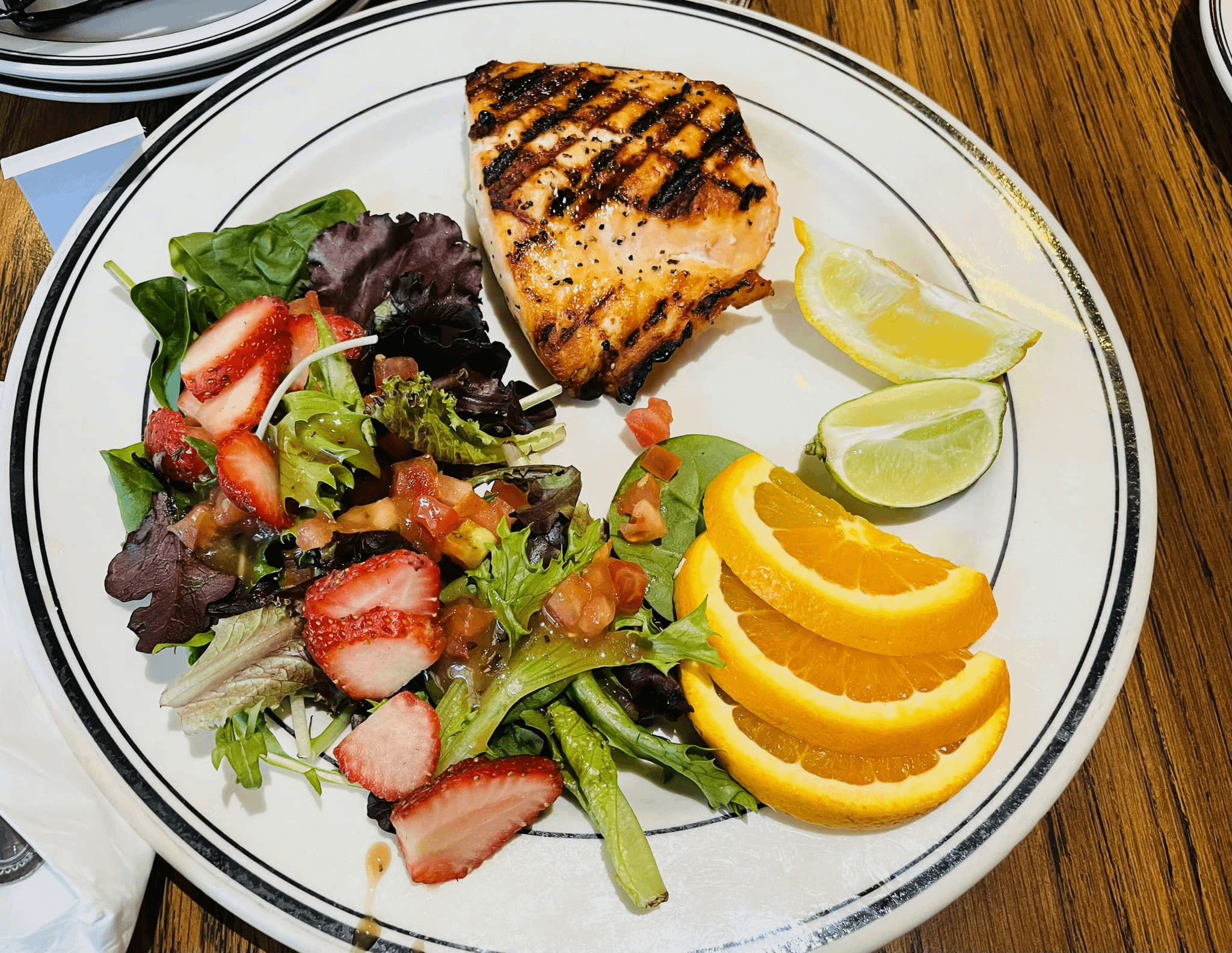 Grilled Salmon with Mixed Green Salad and Fresh Citrus.