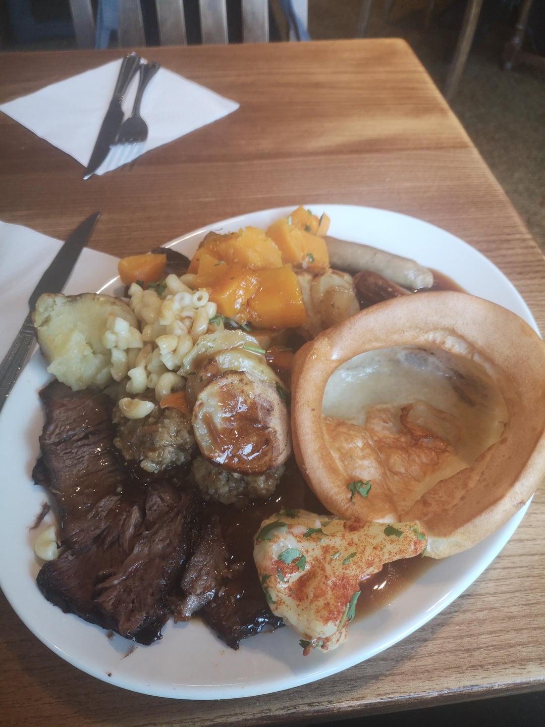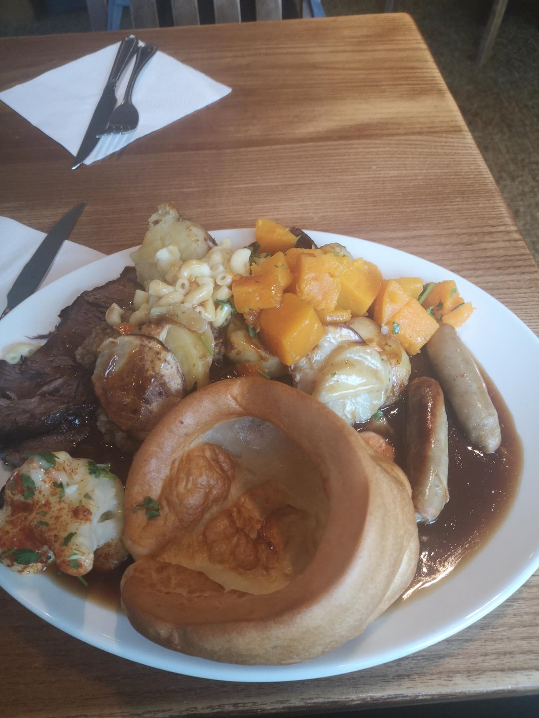The beef is overdone, but the real weird thing is the pasta…and what looks to be mango or peach chunks. What’s the white thing next to the Yorkshire pudding…is that a piece of cauliflower…?