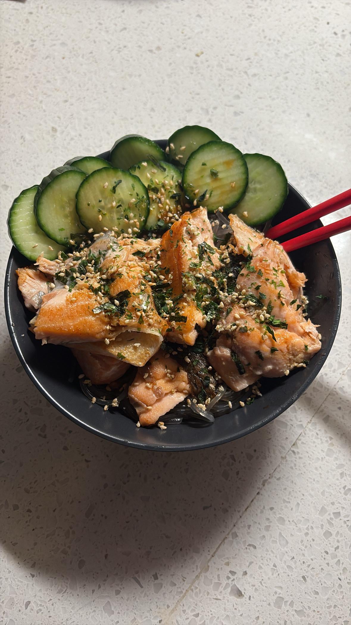 [Homemade] Pan-seared sesame salmon on top of soy marinaded Korean glass noodles with cucumbers and furikake seasoning by lunardownpour Food