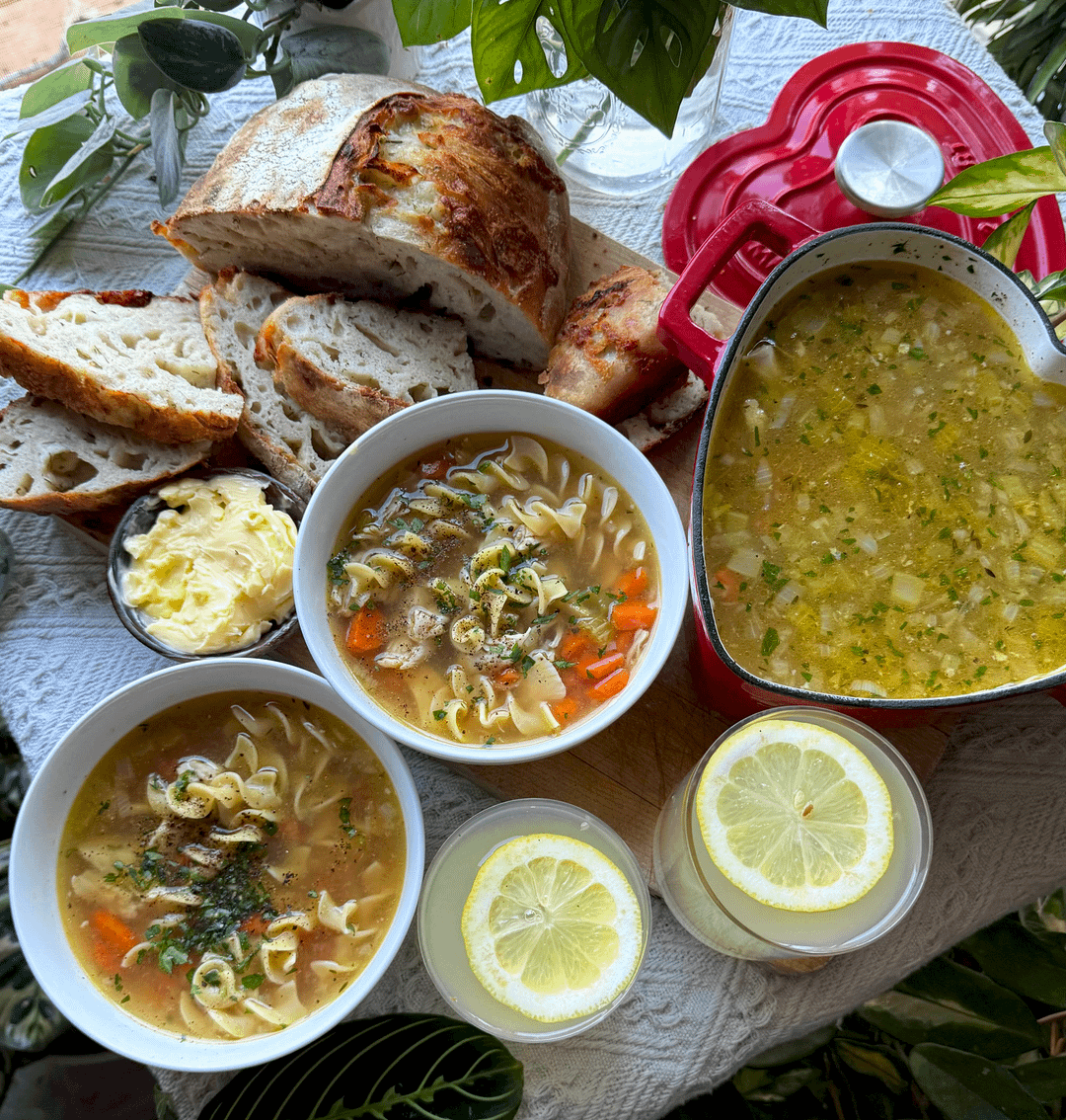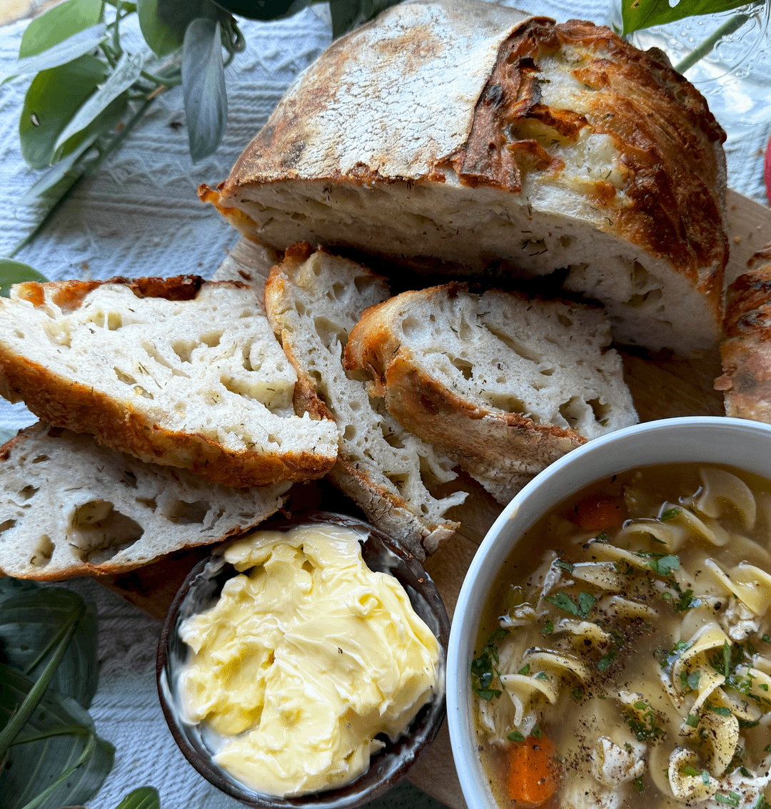 Homemade chicken noodle soup + freshly baked havarti/sharp cheddar dill sourdough for dinner tonight by softrotten Dinner Tonight Tonight's Dinner