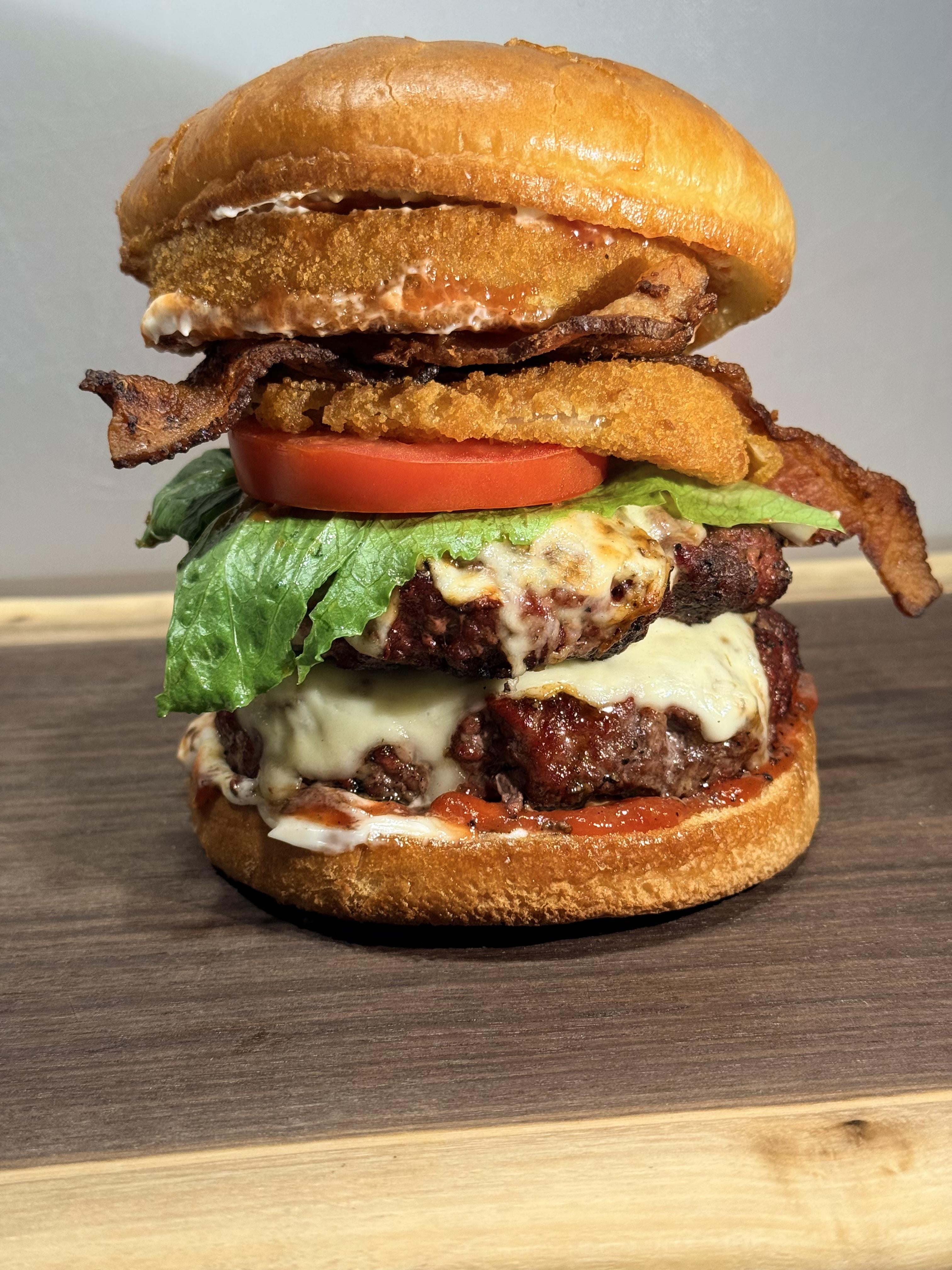 Homemade Charcoal Grilled 1 Pound Double Bacon Cheeseburger Two Measured 8 Ounce Patties with Pepper Jack