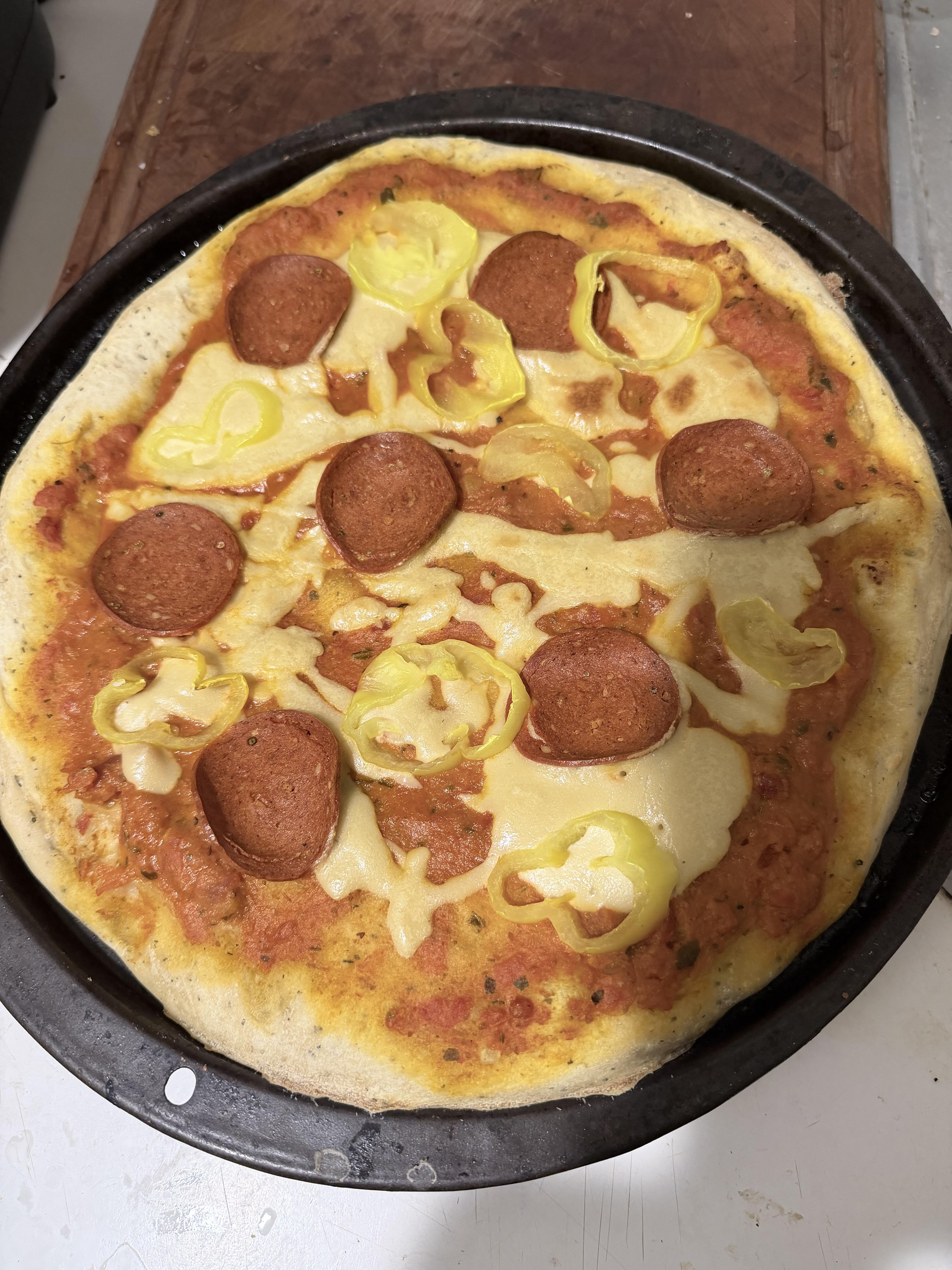 I made my first homemade pizza using a garlic and herb dough from Trader Joe’s, Field Roast pepperoni, banana peppers and cheese from the pourable Miyokos recipe.