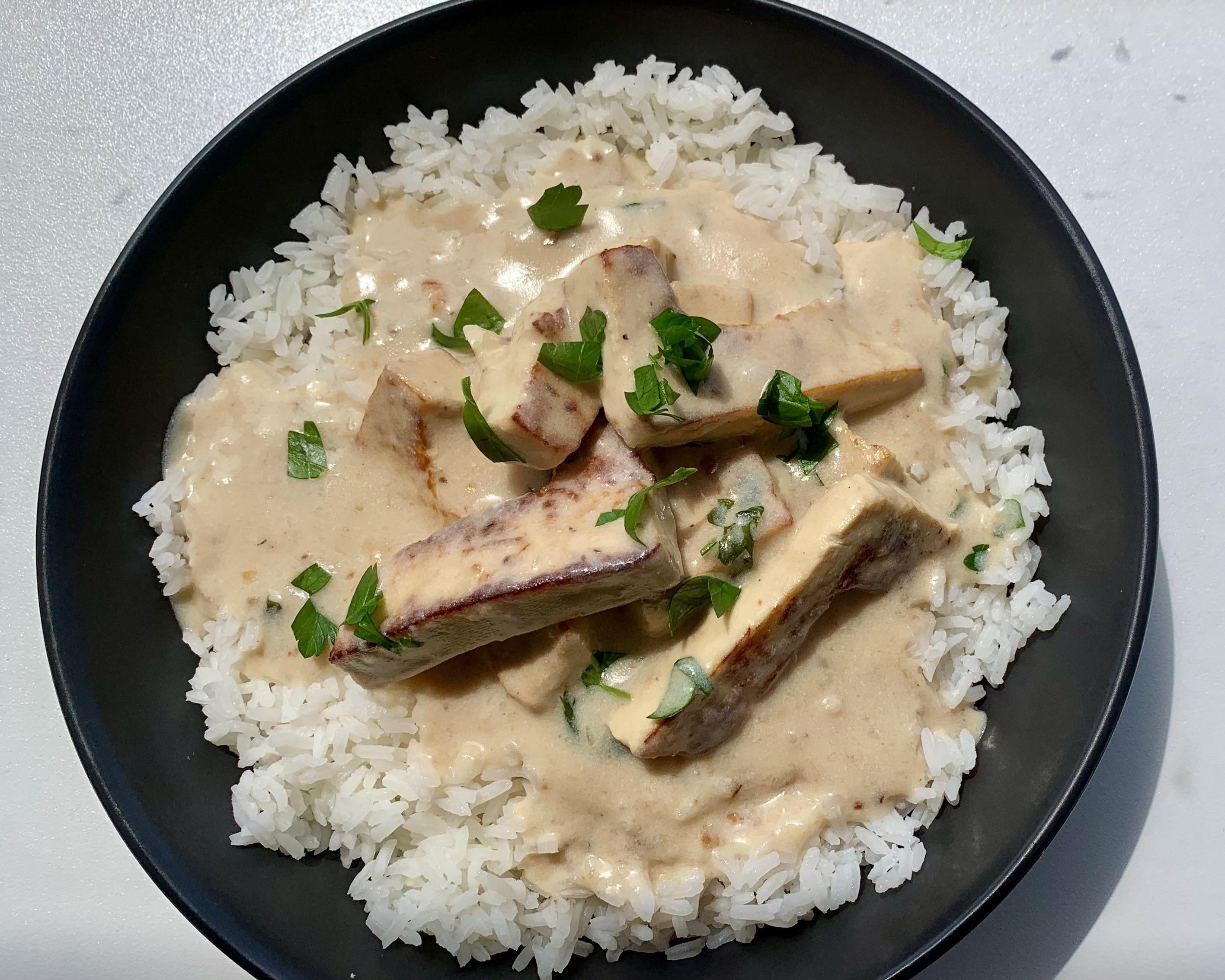Creamy Garlic Tofu Prawns (Serves 3, use more tofu to serve 4 or double the recipe for meal prepping) –