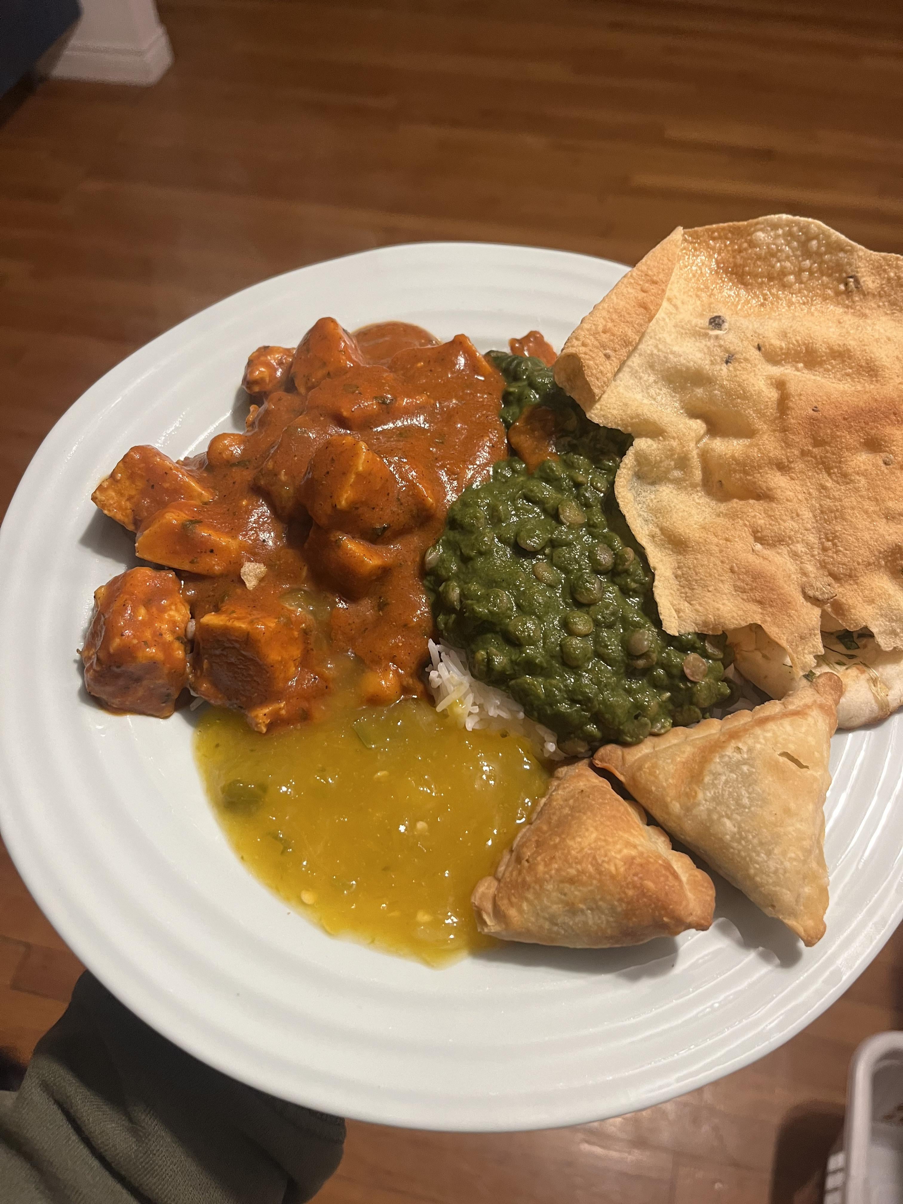 Homemade “Butter” tofu, Emerald Dahl and mango chutney. Purchased samosas from a local restaurant 😋 by EffectiveCartoonist3 Vegan Food Vegan Food Porn