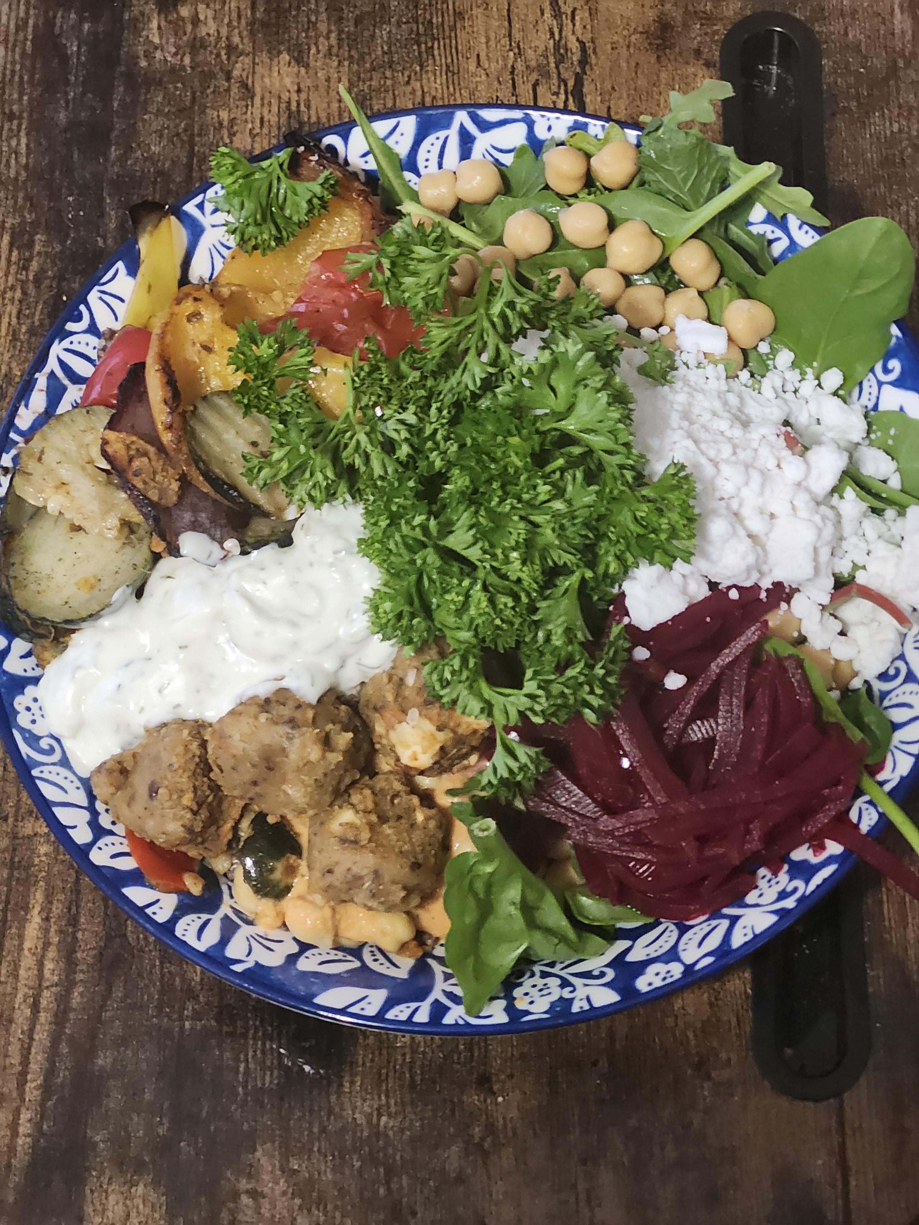 Equal parts, quinoa, black rice and black lentils. Chia and Hemp seeds and seasoned with salt, garlic (fresh and dried) turmeric and nooch.