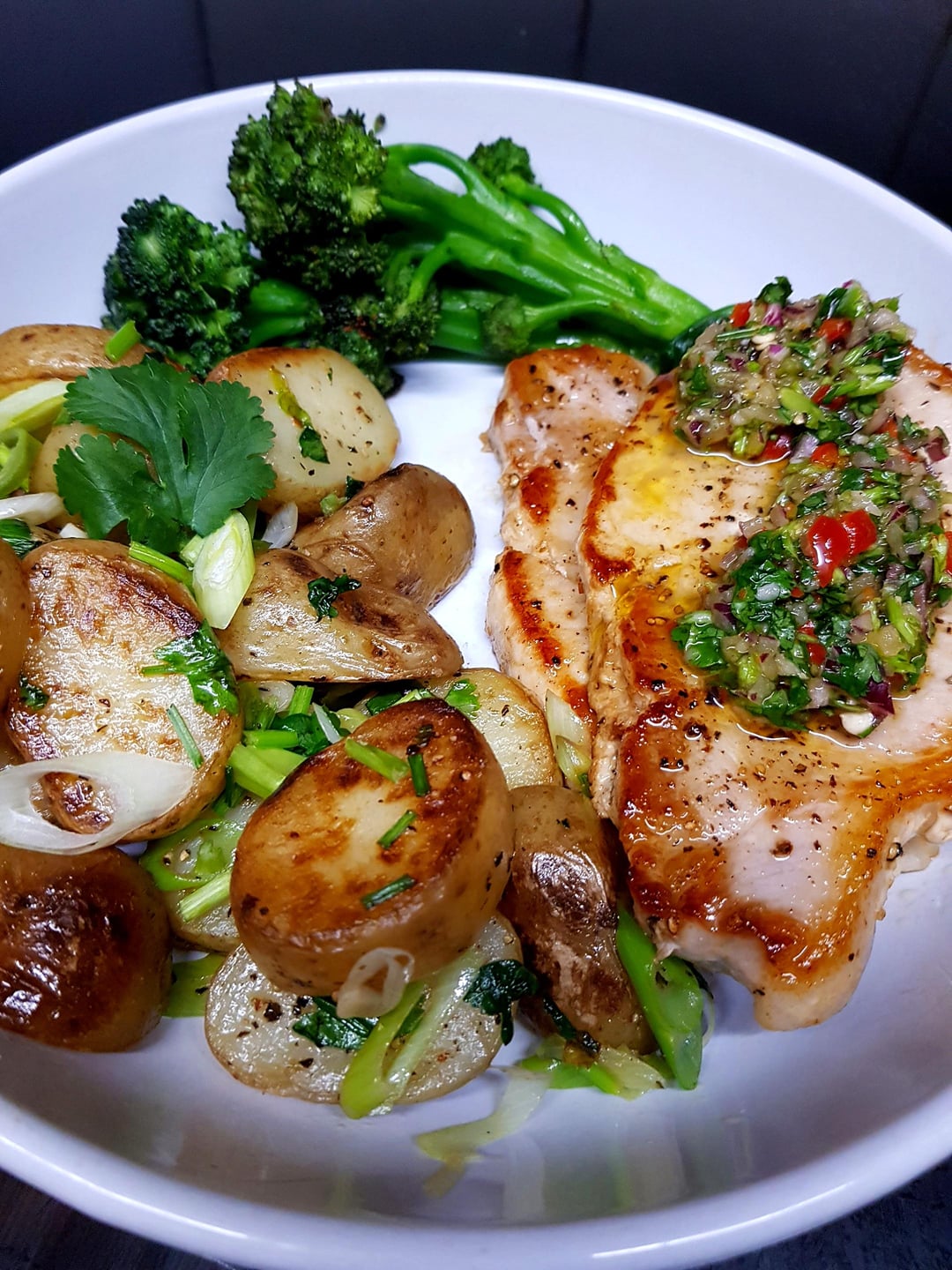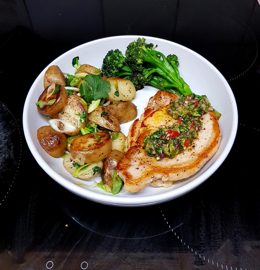 Pork Loin Steaks Steaks with Chimichurri, Fried New Potatoes Tossed in Herbs and Tenderstem Brocolli.