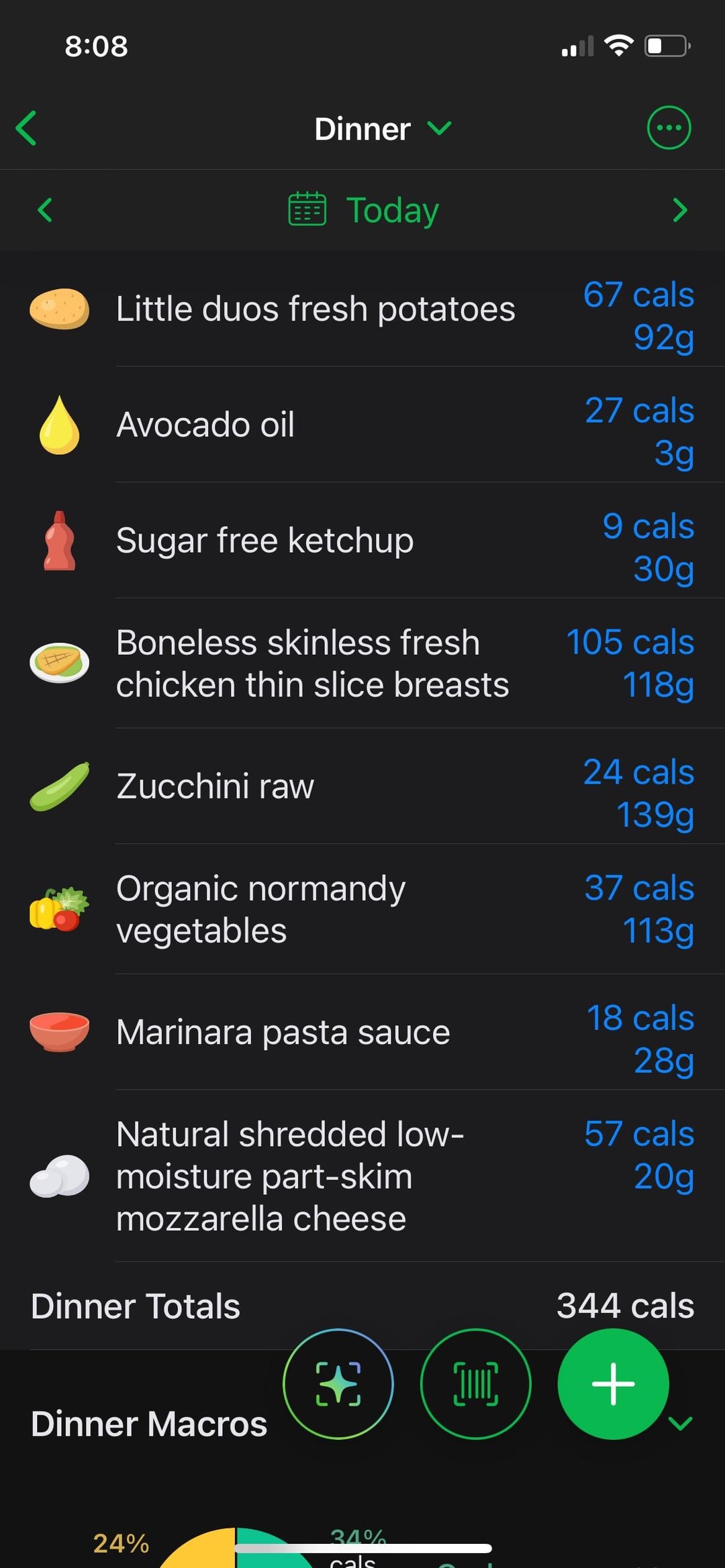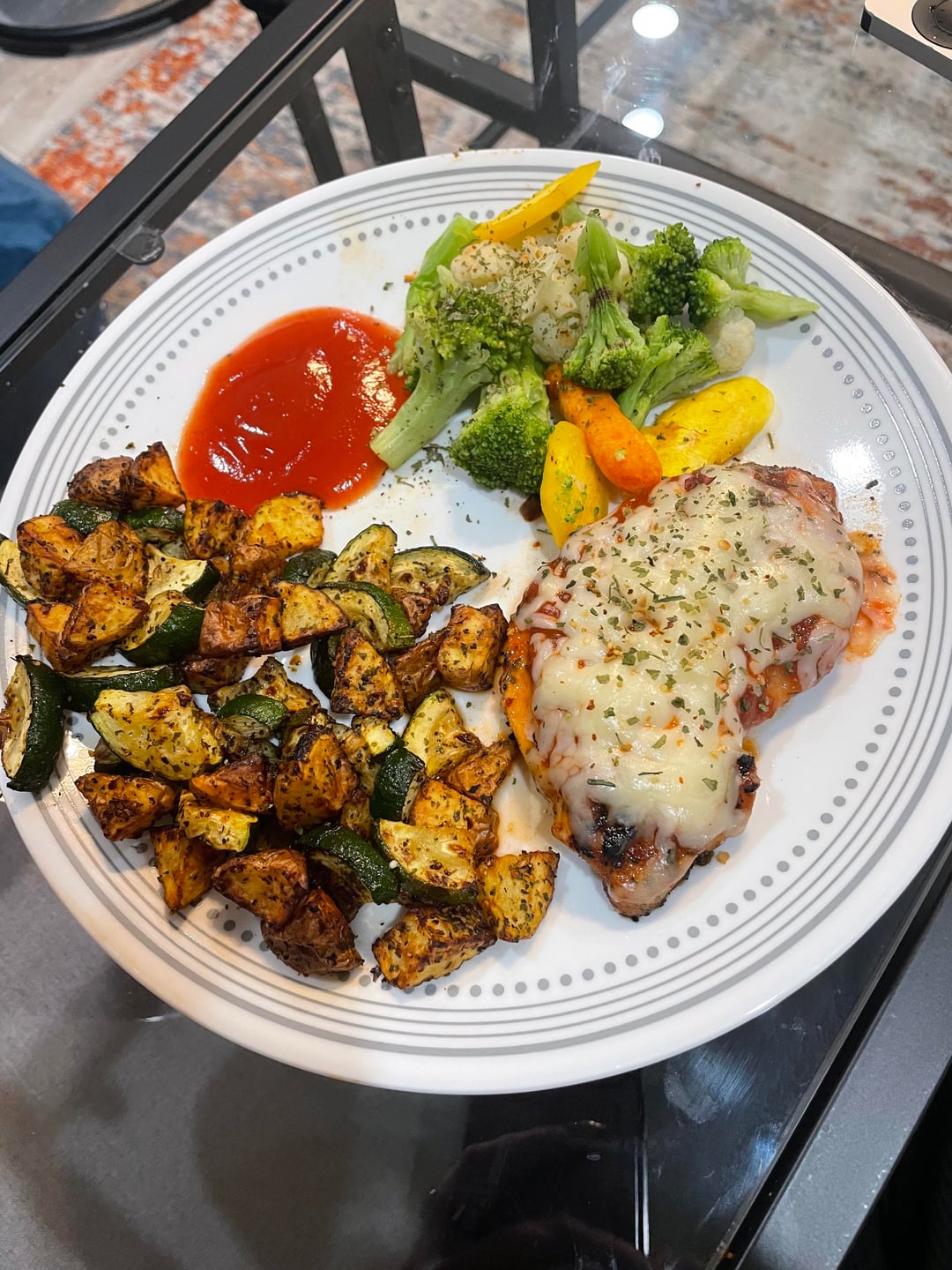 Dinner: Chicken breast topped with marinara and mozzarella, air fried potatoes & zucchini, steamed vegetables