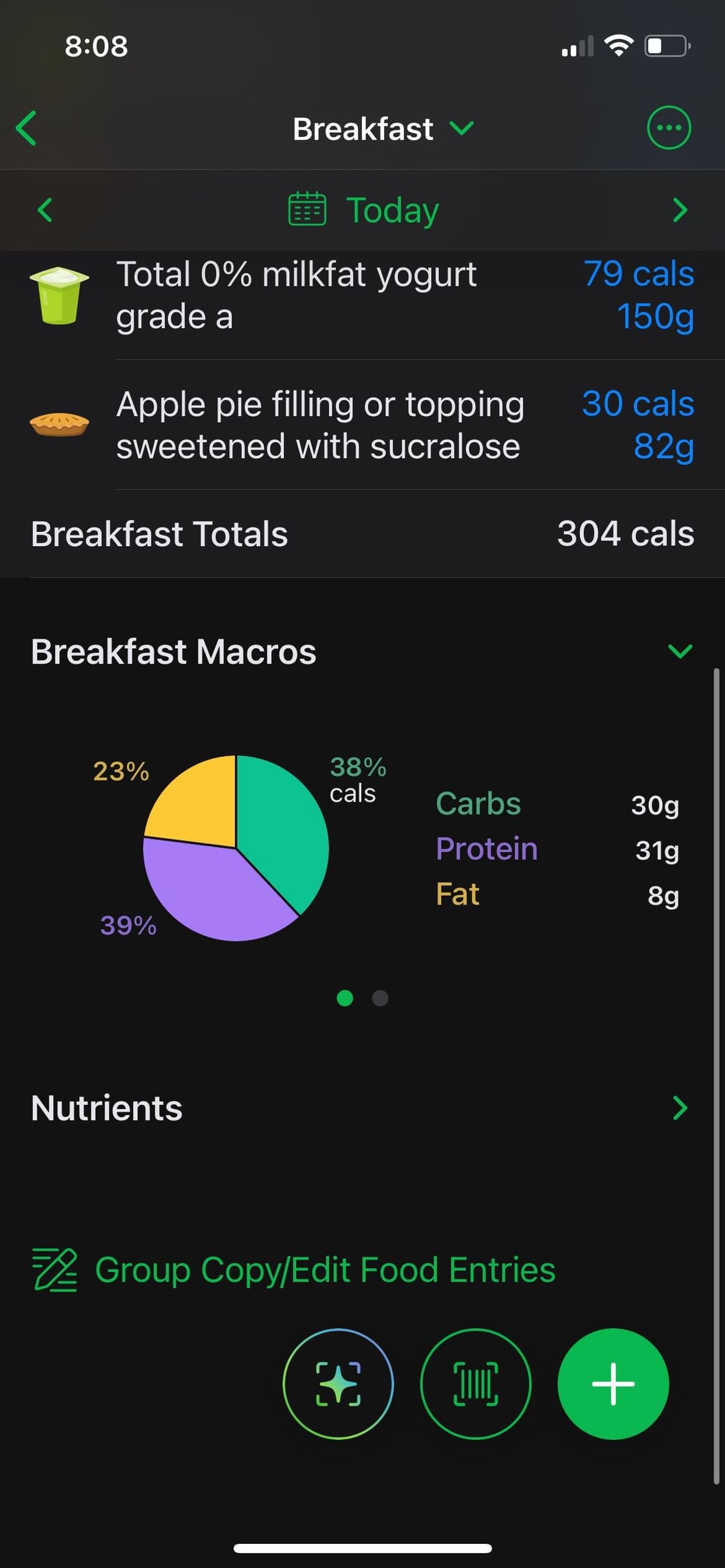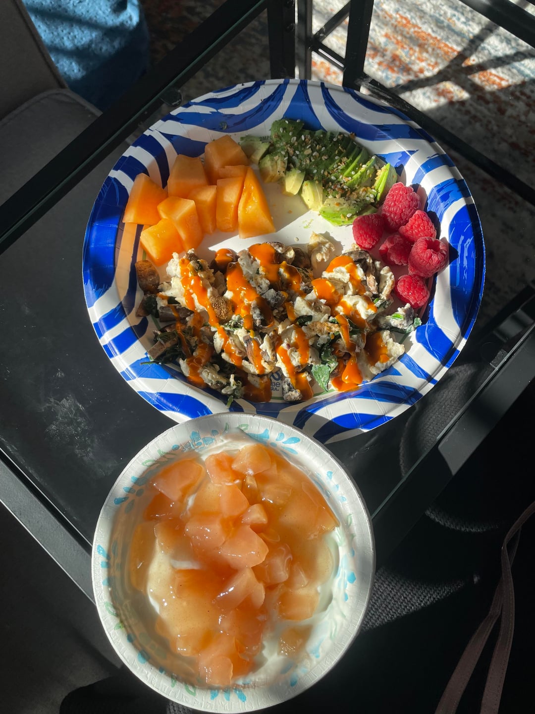 Breakfast: Egg whites with sautéed mushrooms and spinach, raspberries, cantaloupe, avocado with everything but the bagel seasoning. Fage Greek yogurt mixed with caramel skinny syrup and topped with sugar free apple pie filling.