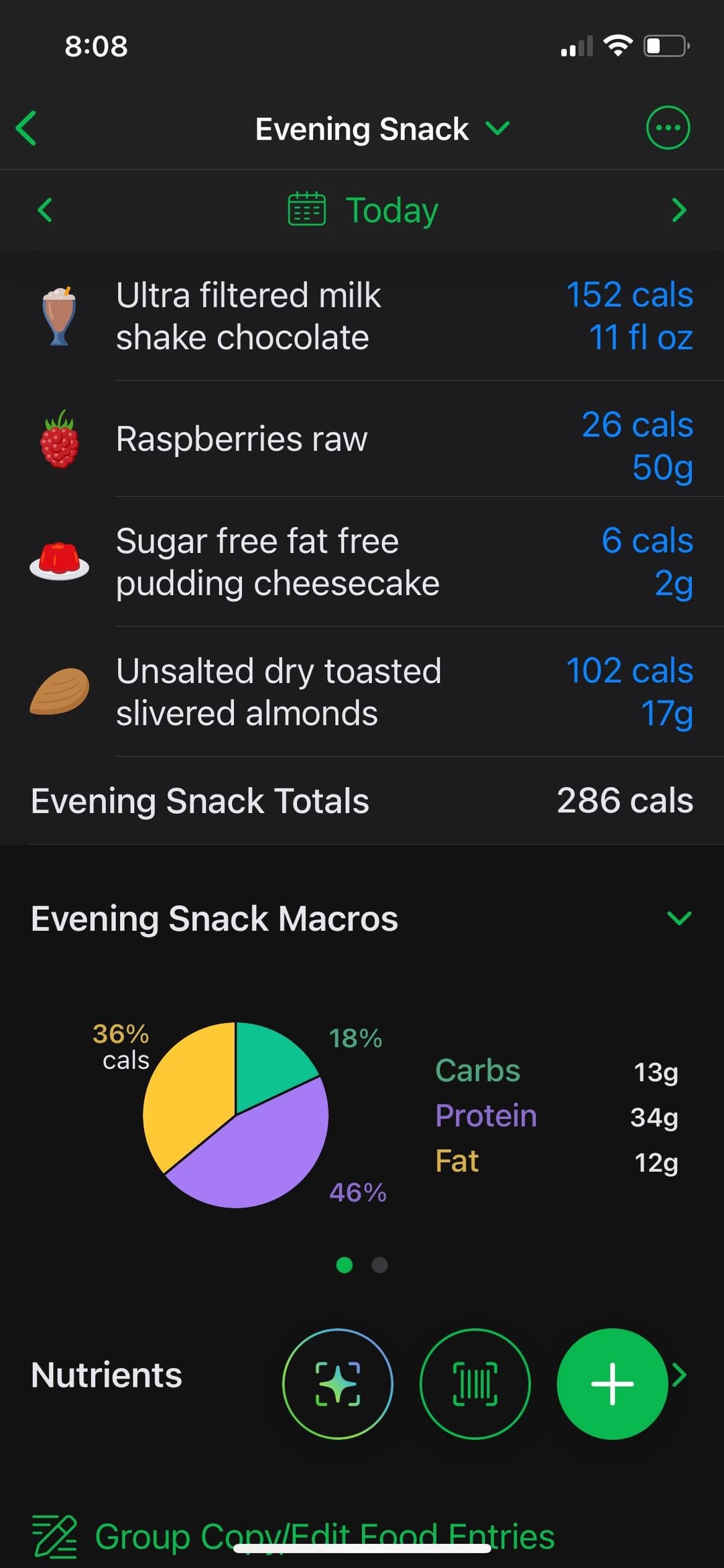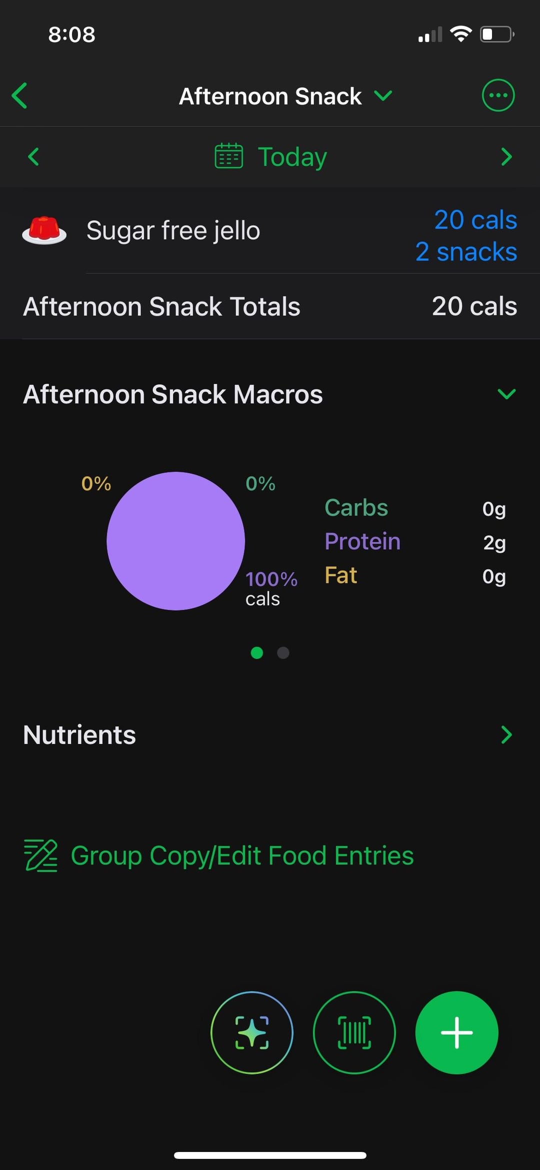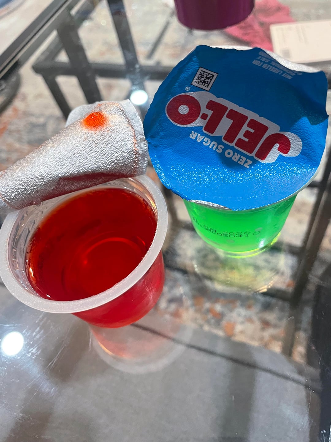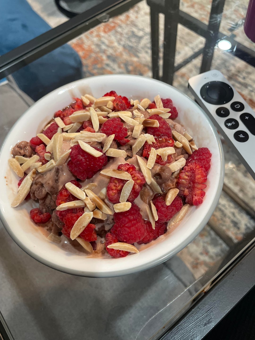 Snacks: 2 Jello cups, Protein Ice Cream made in the Ninja Creami topped with dry roasted slivered almonds & raspberries