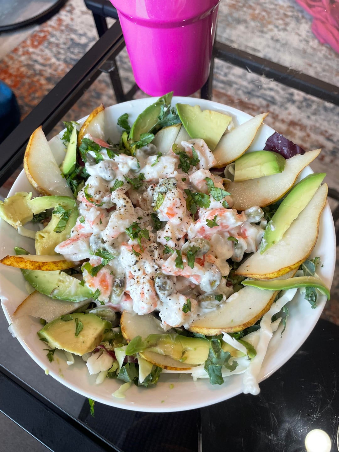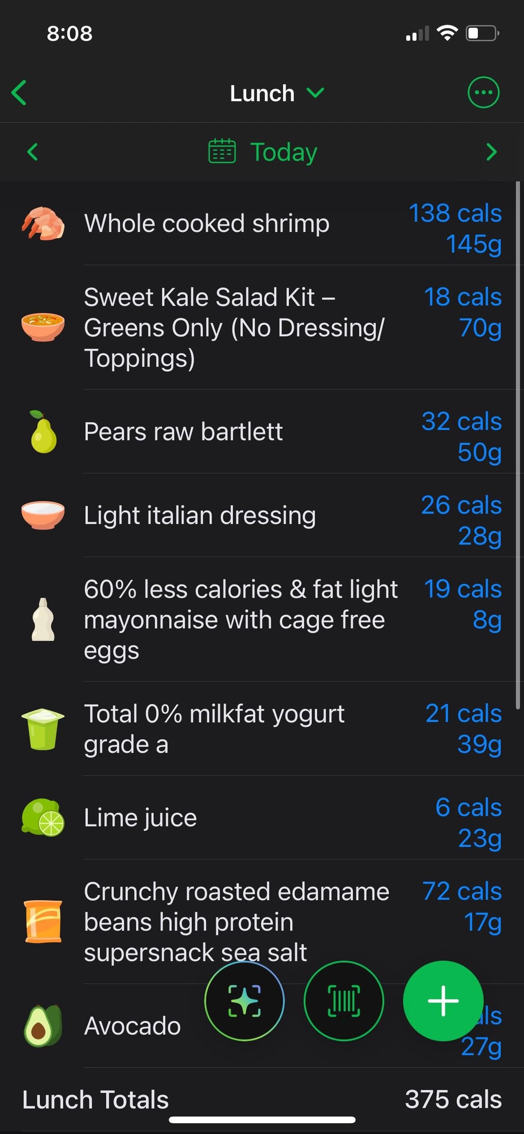 Lunch: Sweet Kale chopped salad kit (no dressing or toppings), Olive Garden light Italian dressing, avocado, pear, and shrimp salad (chopped shrimp, dried edamame, light mayo, Greek yogurt, lime juice and seasonings)
