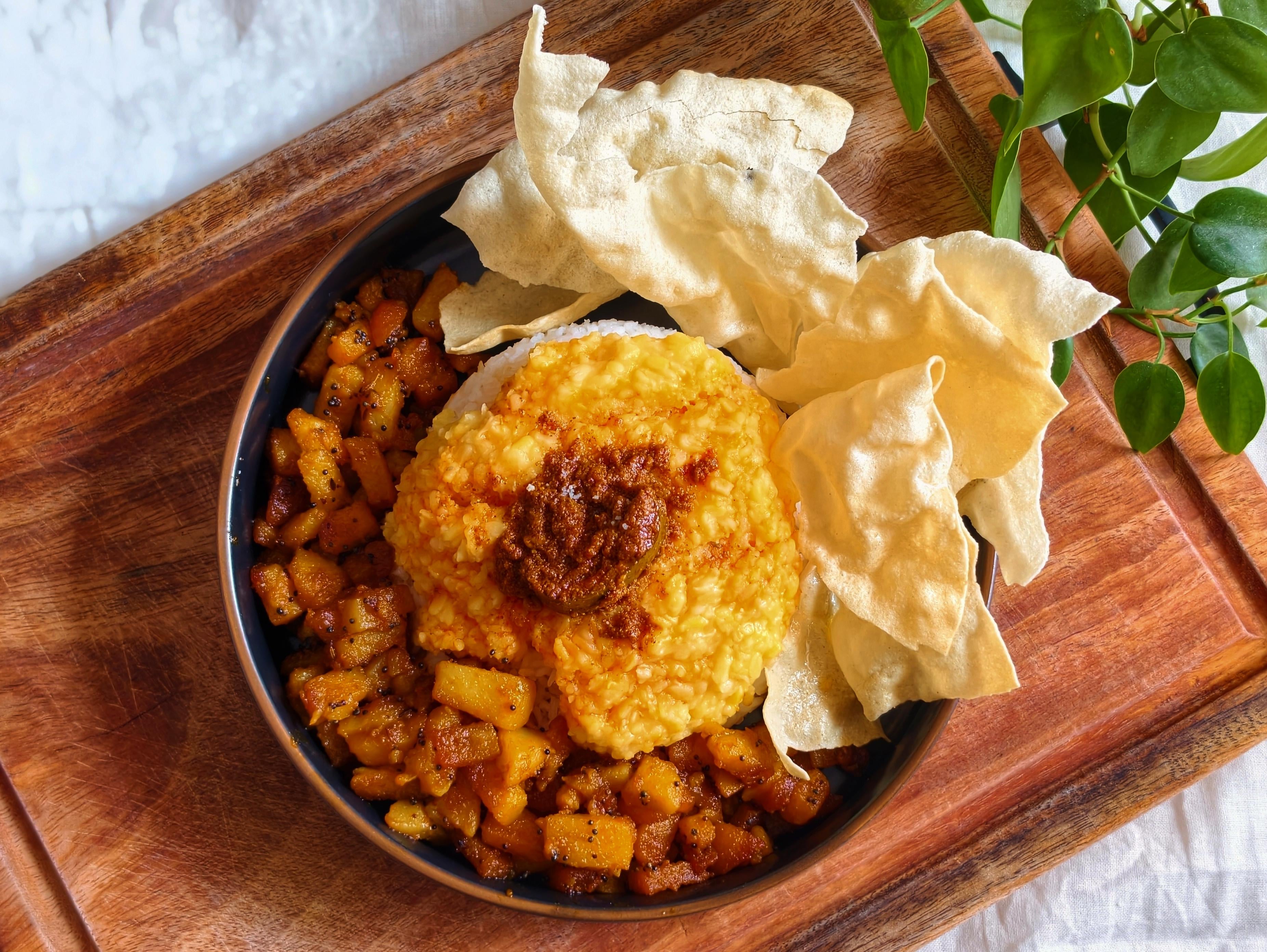 Moong dal stew along with potato fry, Mango pickle and papad.