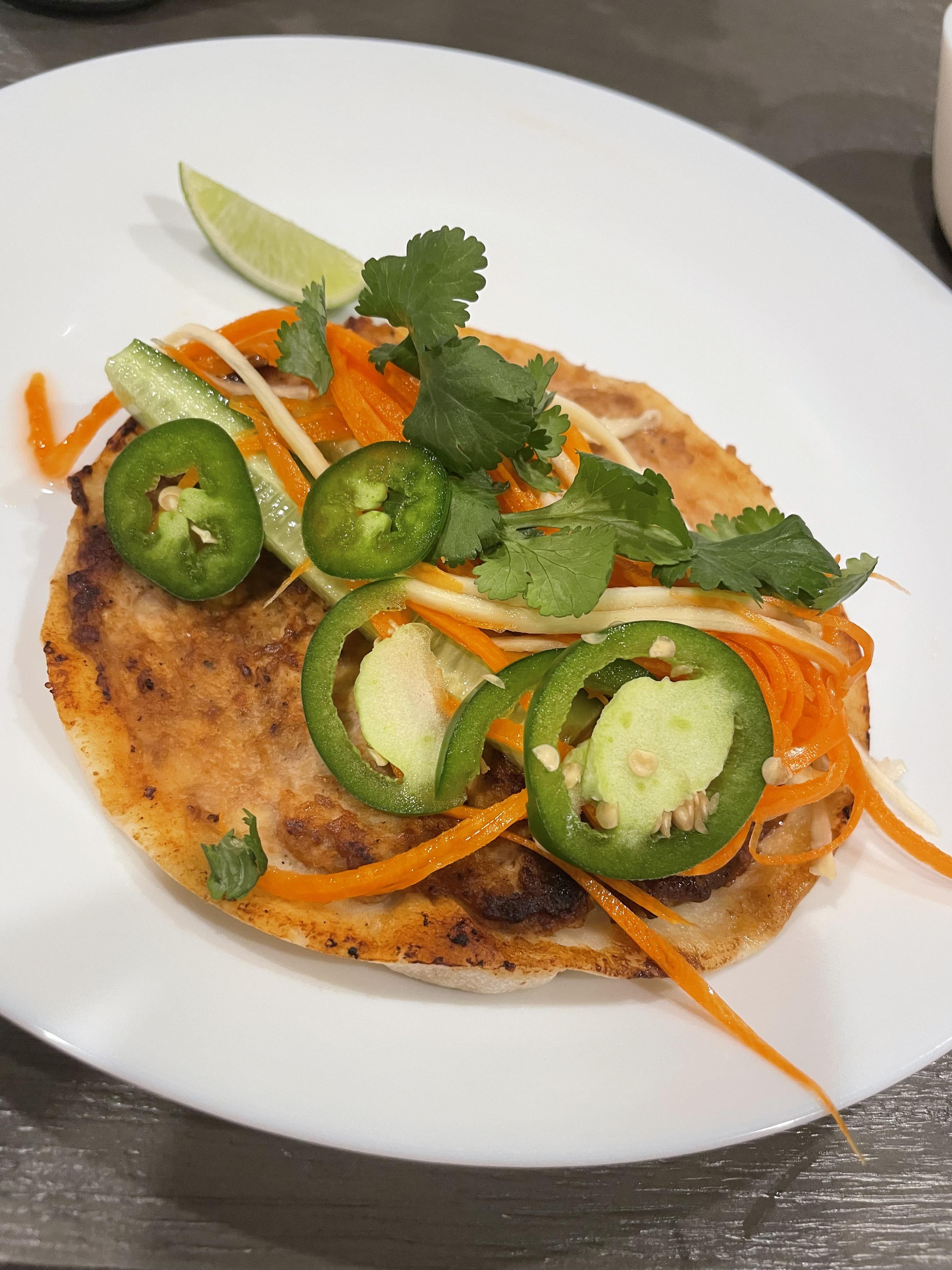 Sesame Crusted Tuna Steak with (Hidden) Saucy Udon Noodles. Pickled Cucumber and Radish, Snap Peas, Edamame, Avocado and Herbs. Plus Extra Seeds.