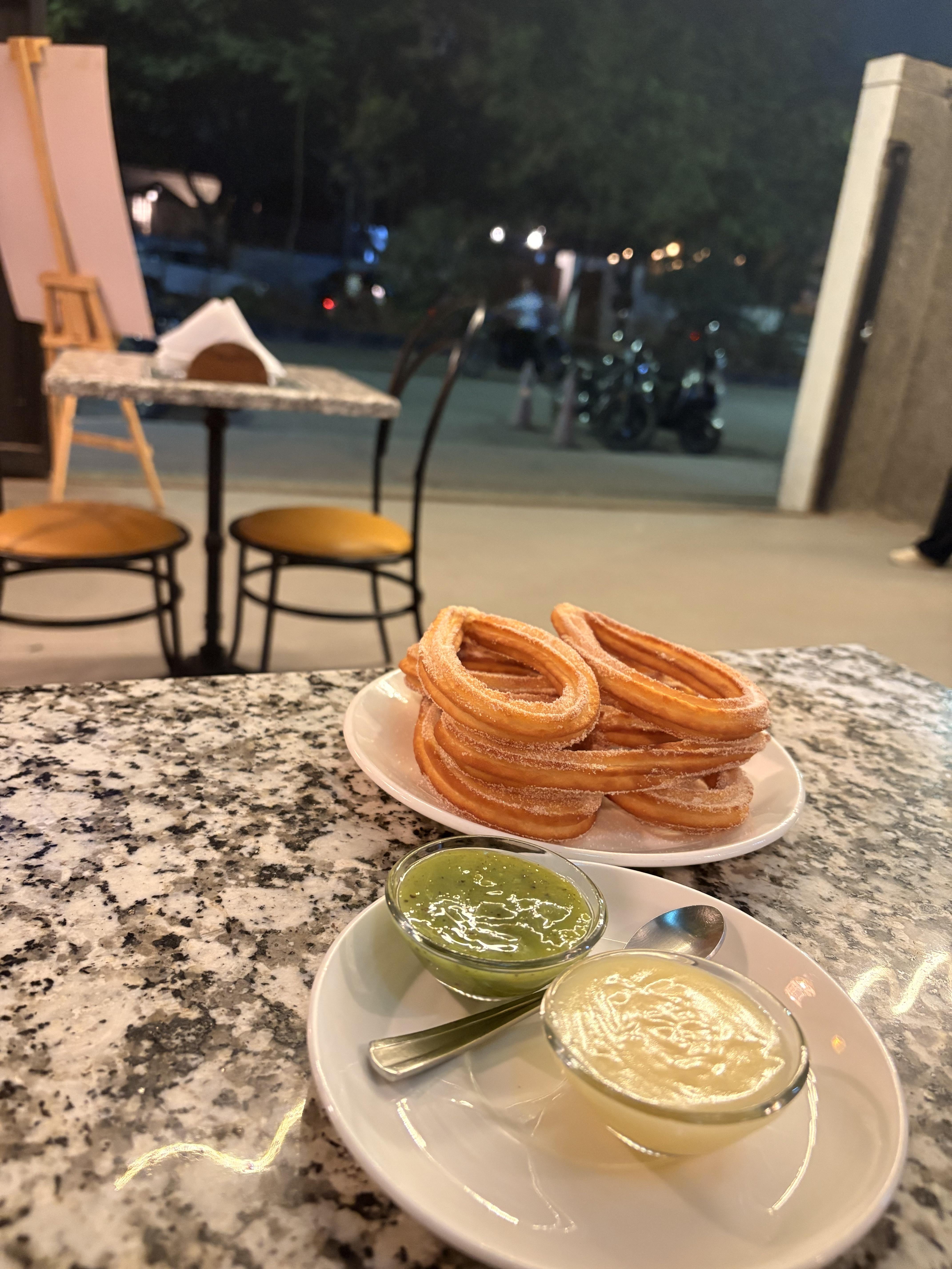 Churros with pistachio and white chocolate dip 🌼