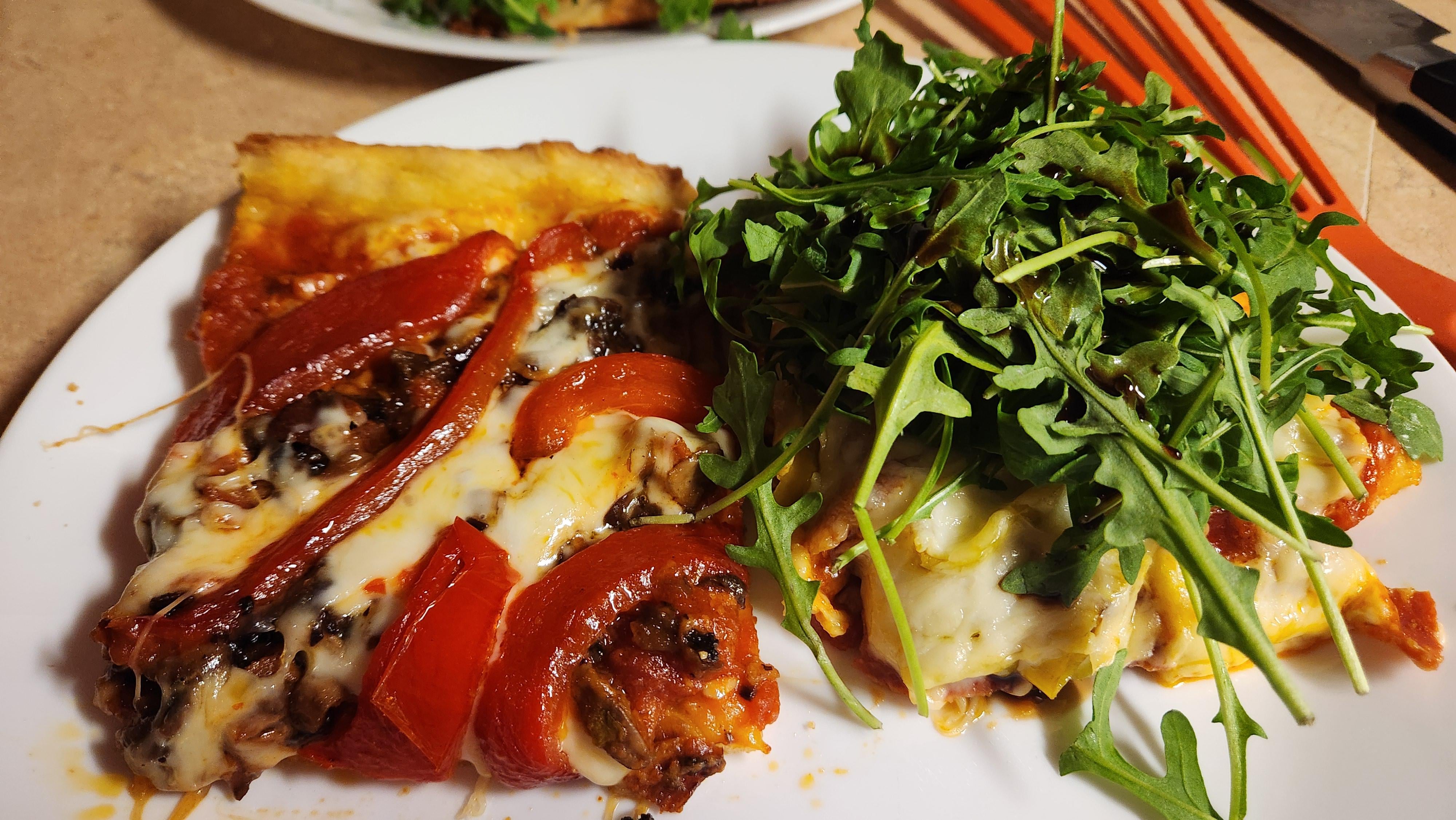 On the right: The Coherence – Turkey pepperoni and peperoncini topped by an arugula salad with a honey and balsamic drizzle.