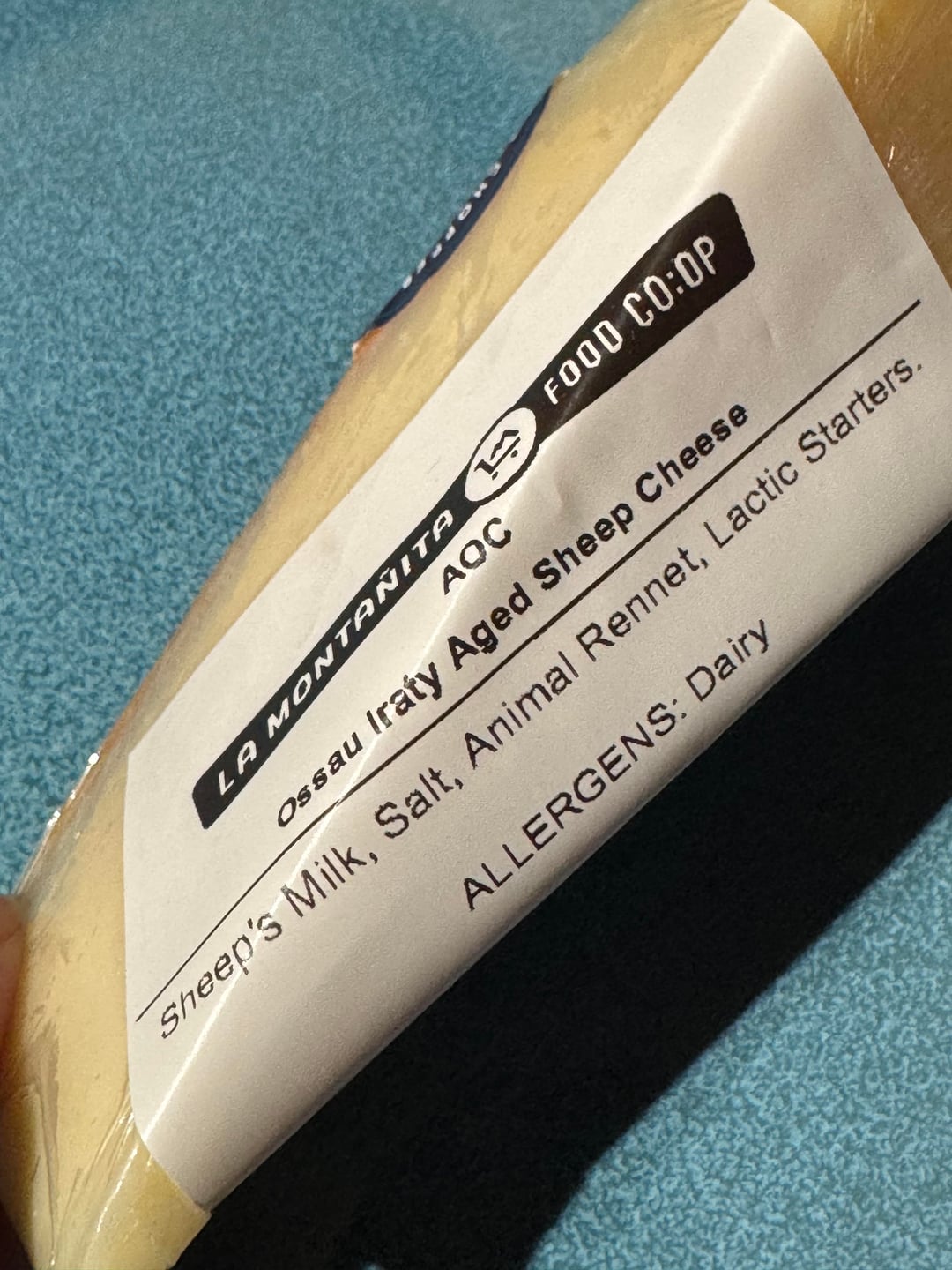 This wedge at a cheese counter had a Lamb Chopper sticker, but the wax is orange-ish and the printed label says Ossau Iraty. I’ve never had Ossau Iraty, but am thinking the label is correct the sticker was a mistake. The cheese is fantastic, though.