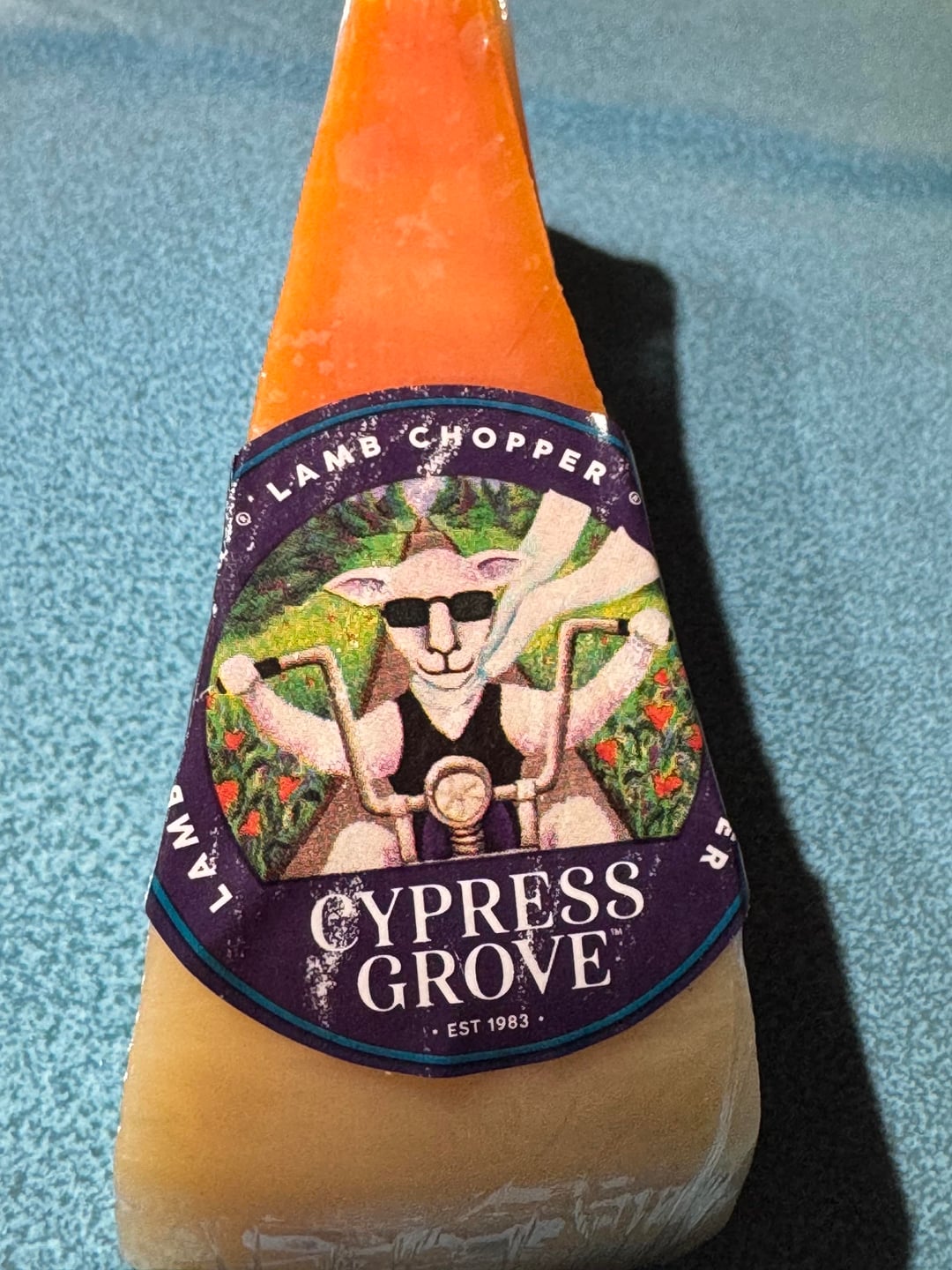 That cheese turns orange under the rind.looks like they peeled the wax off.it’s definitely lamb chopper.