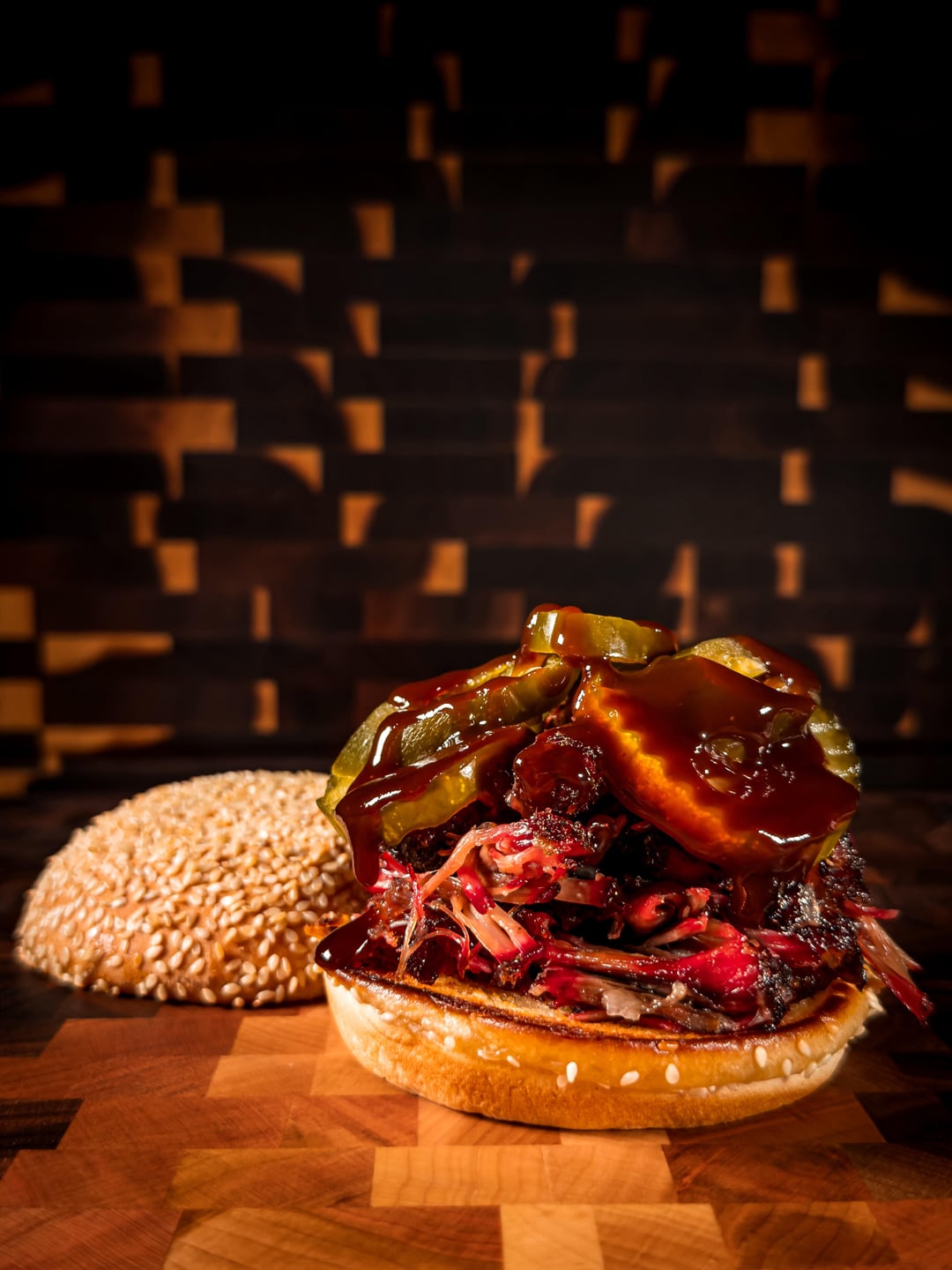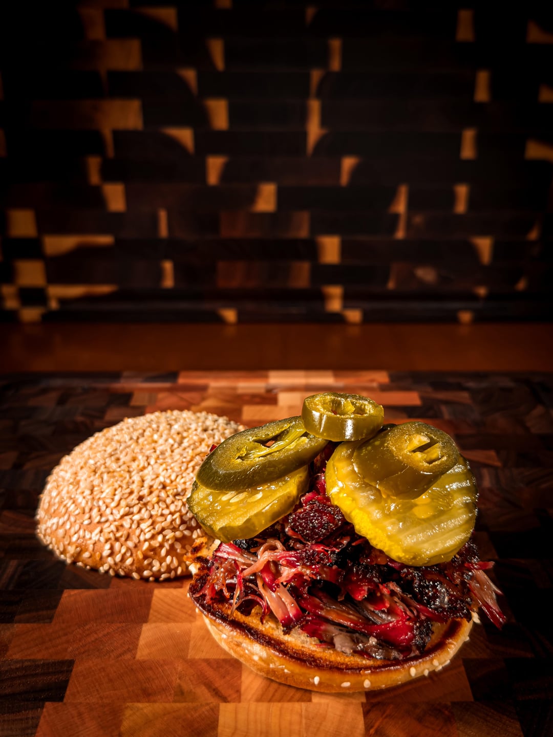 Sandwich is toasted sesame bun, the shredded oxtail, Wickles pickles and jalapeños, and some Kinder’s hickory brown sugar bbq sauce.