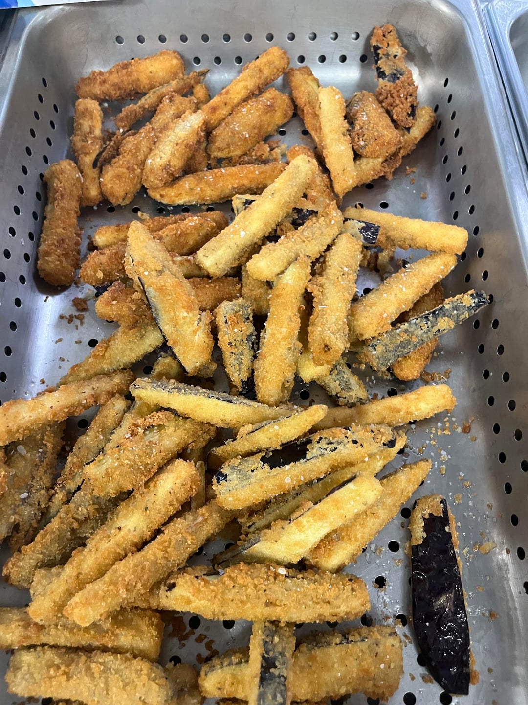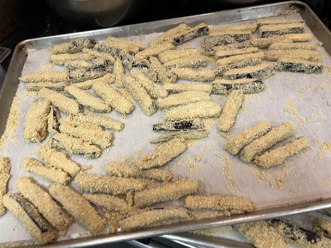 Today at work I made eggplant fries from scratch- hand cut eggplant soaked in saltwater, then a dry-wet-dry dredge of seasoned flour, oatmilk/flax, and seasoned panko. Served with pomodoro. Our guests like vegetables much, but these sold really well!
