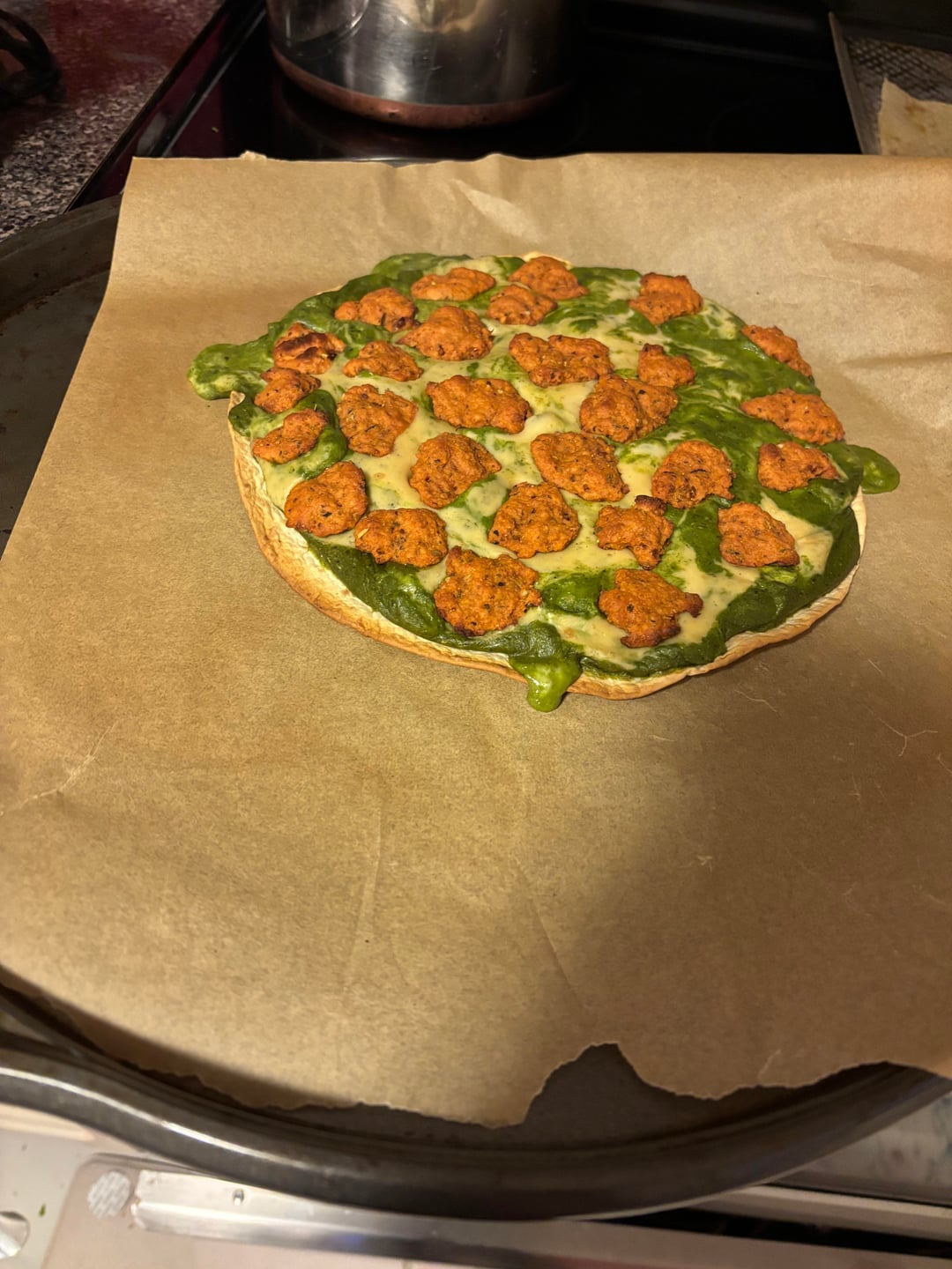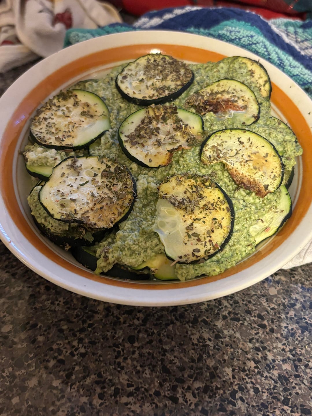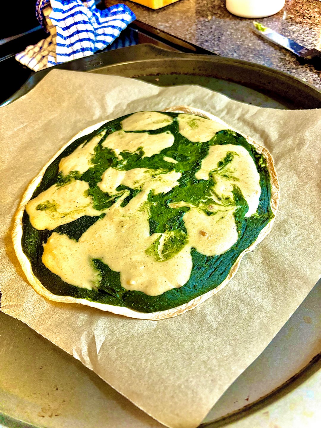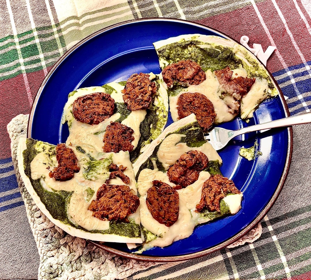 Blanch 3 oz fresh basil in ice water for ten minutes before blending in a ln immersion blender with 28 g pistachio 28 grams cashew 2 tbsp nutritional yeast 1 garlic clove 1/ tbsp diced onion 1 tsp sea salt 1 tsp oregano 1 tsp parsley 1 tsp rosemary 1 tsp sage 1 tsp lemon pepper 1/2 tbsp vinegar 1/4 cup algae or olive oil. Use immediately for vegetables pizza pasta or whatever or store in jar up to 3 days. Add 1/2 cup soy milk and 1 tbsp tapioca flour for pesto Alfredo.