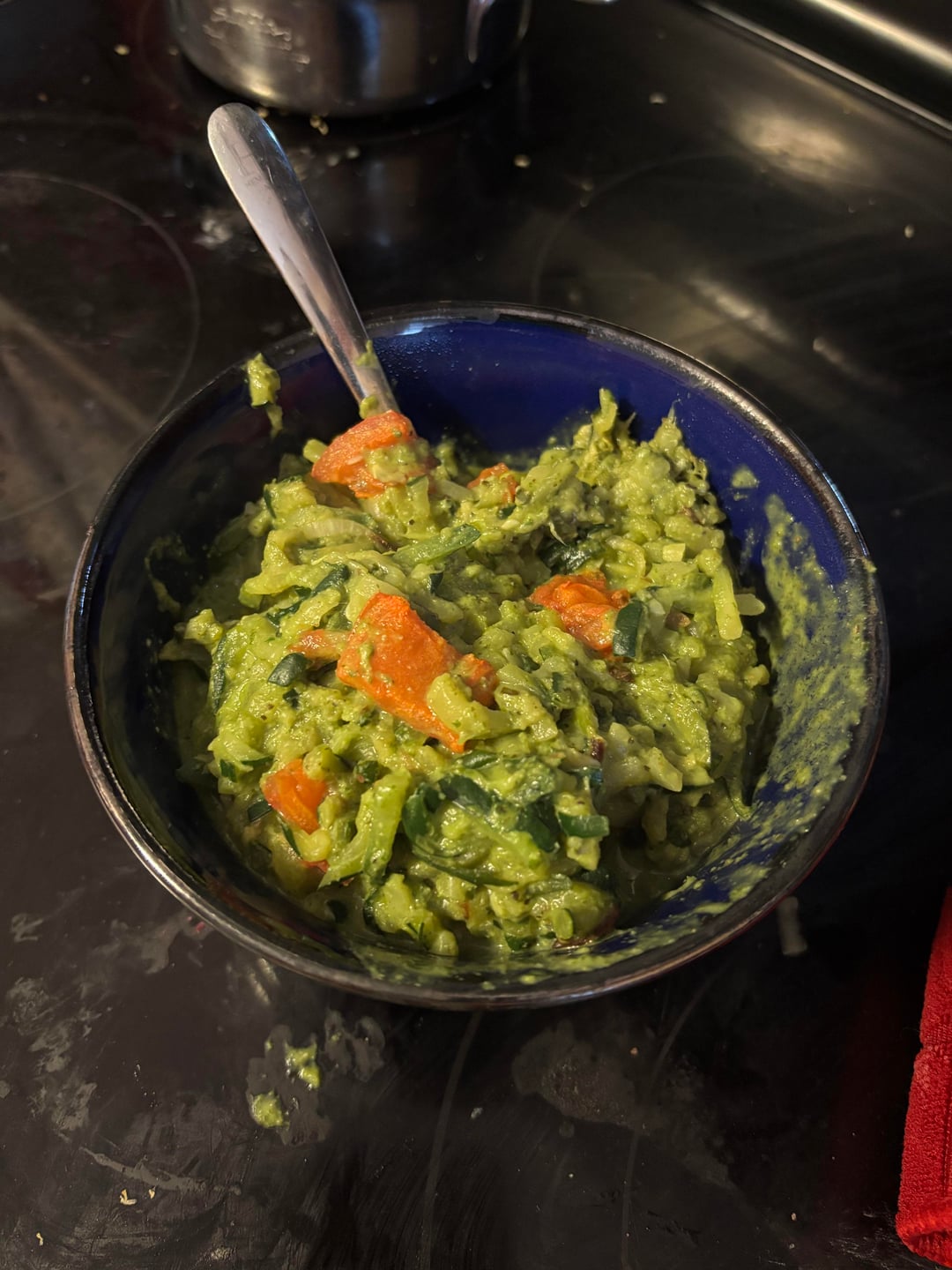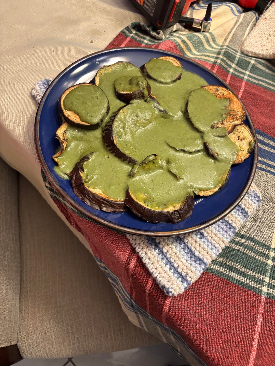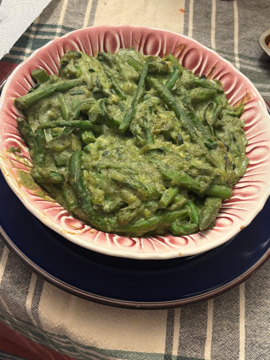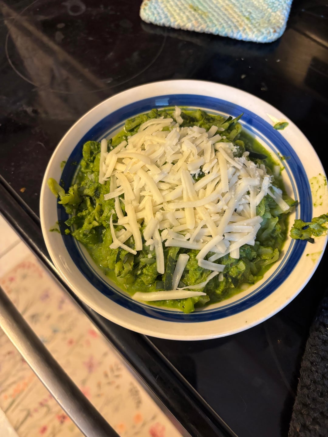 Blanch 3 oz fresh basil in ice water for ten minutes before blending in a ln immersion blender with 28 g pistachio 28 grams cashew 2 tbsp nutritional yeast 1 garlic clove 1/ tbsp diced onion 1 tsp sea salt 1 tsp oregano 1 tsp parsley 1 tsp rosemary 1 tsp sage 1 tsp lemon pepper 1/2 tbsp vinegar 1/4 cup algae or olive oil. Use immediately for vegetables pizza pasta or whatever or store in jar up to 3 days. Add 1/2 cup soy milk and 1 tbsp tapioca flour for pesto Alfredo.