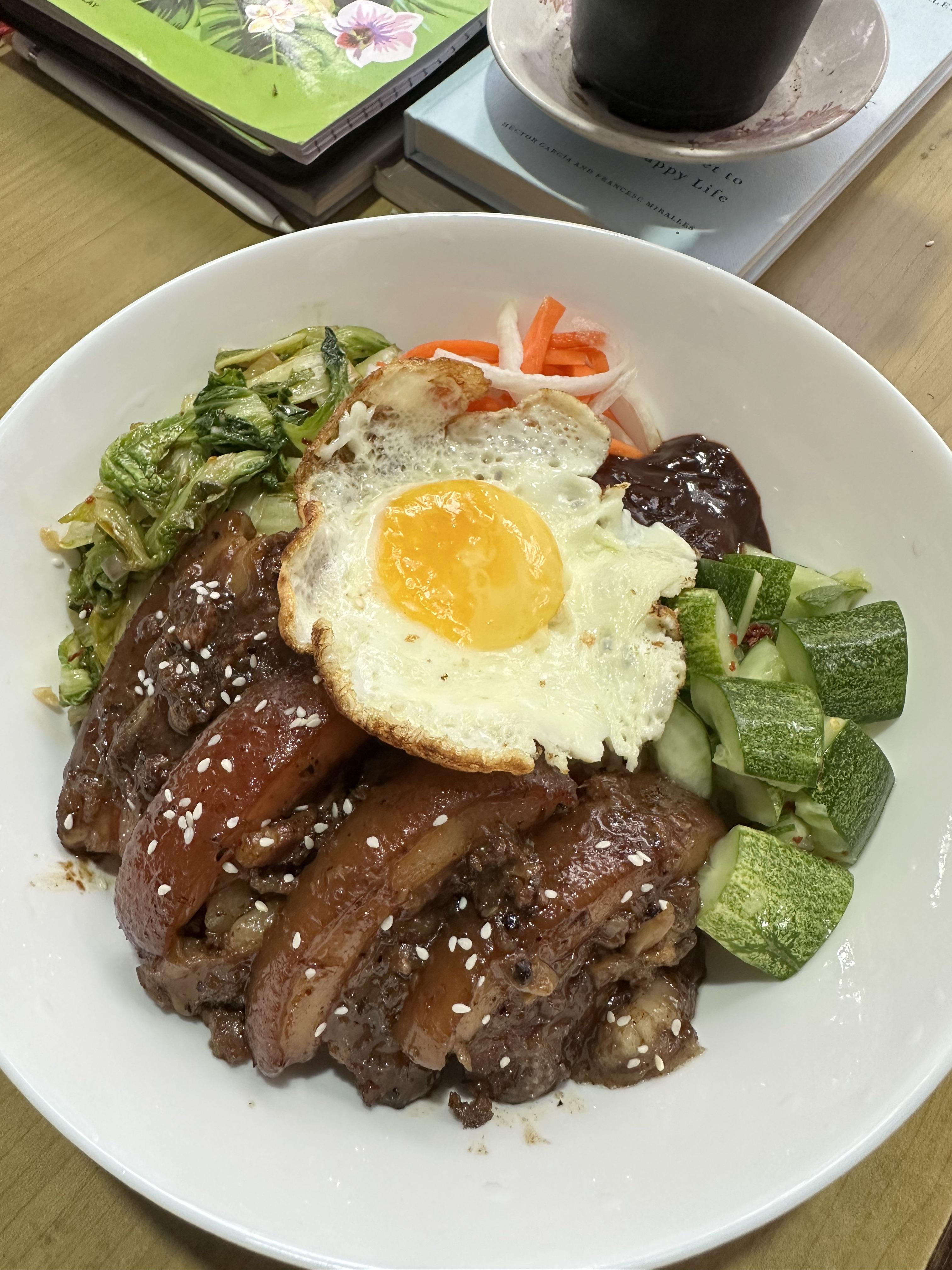 Hong Shao Rou, stir fried bokchoy, pickled veg, crushed cucumber salad and a soy chilli sauce over white rice