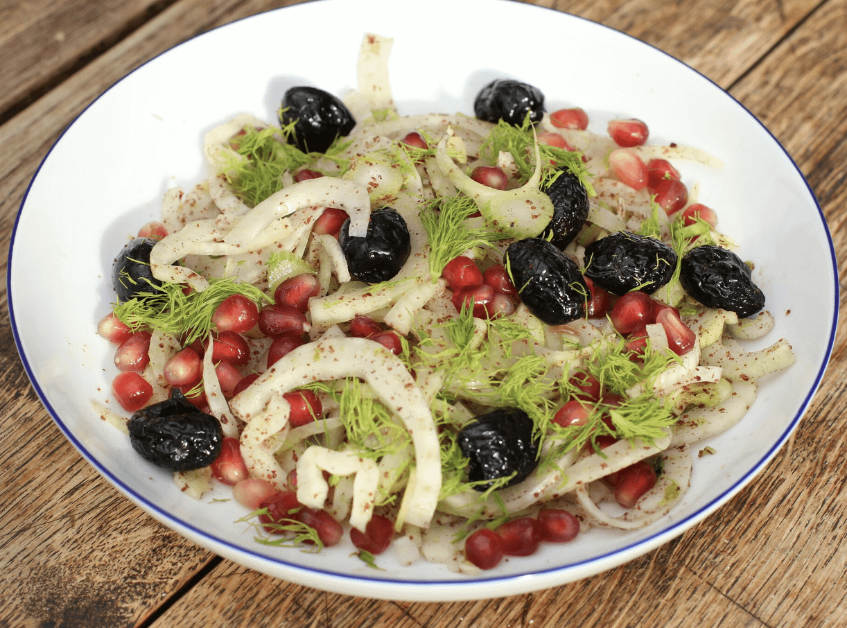3. Tip the fennel into a serving bowl and sprinkle with sea salt, pepper, sumac, pomegranate seeds and olives.