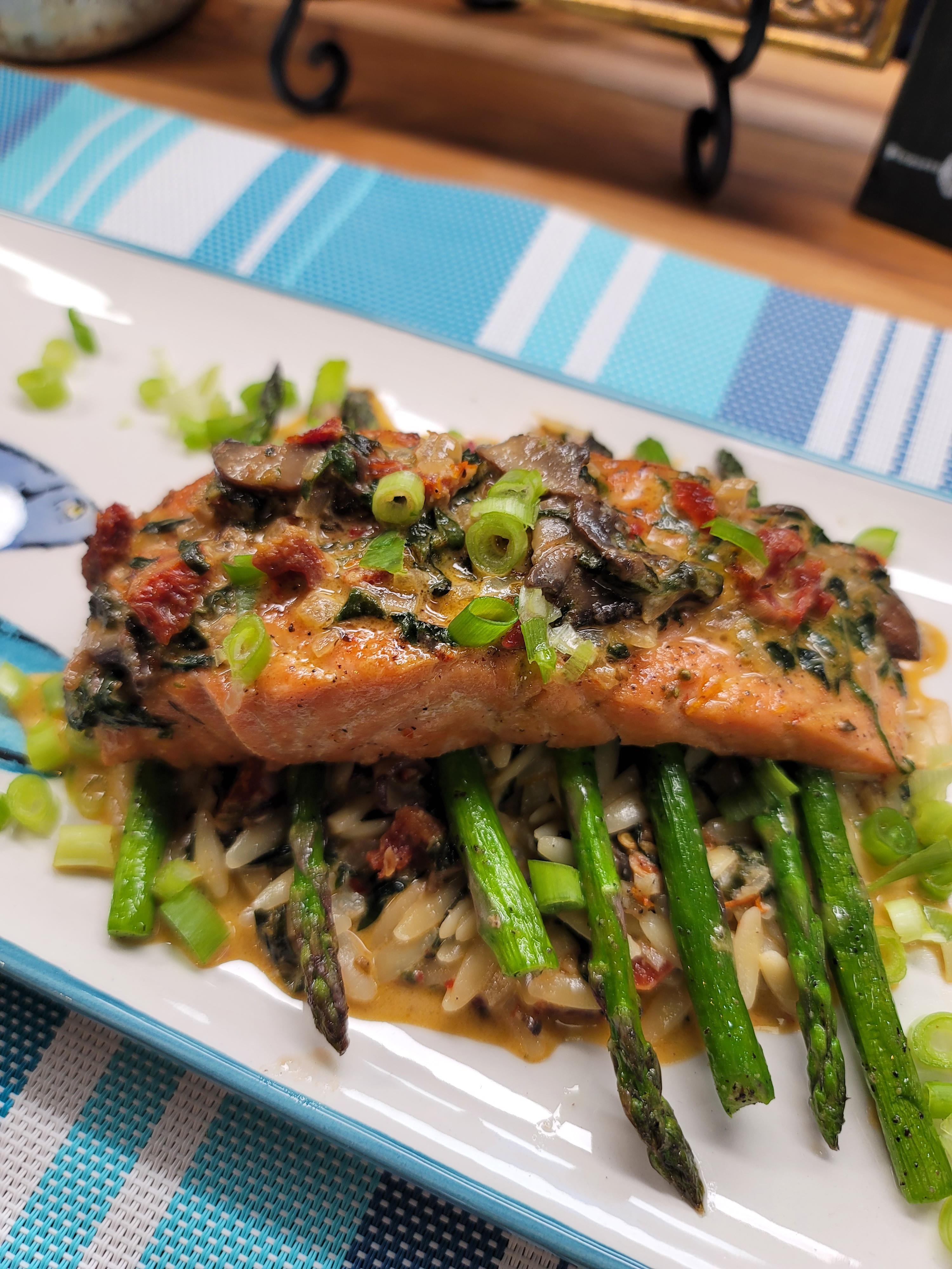 Garlic Butter Tuscan Salmon w/ Orzo & Asparagus!!! The sauce has onion, mushroom, sun dried tomato, basil, oregano, garlic, red pepper flake, heavy cream, chicken stock, salt and pepper.