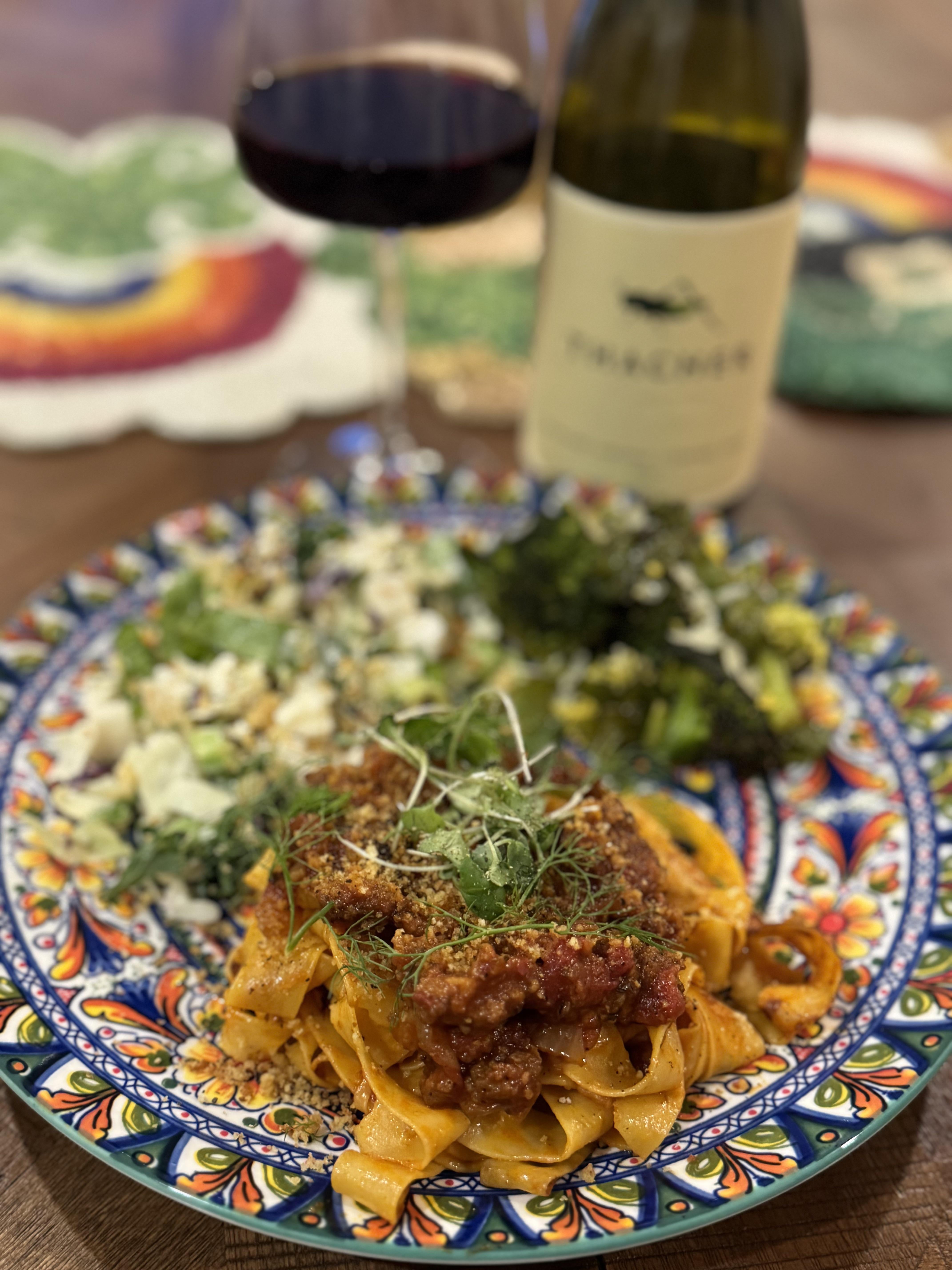 Fresh pasta, spicy tomato and Italian sausage ragu with onion and fennel… SO good.