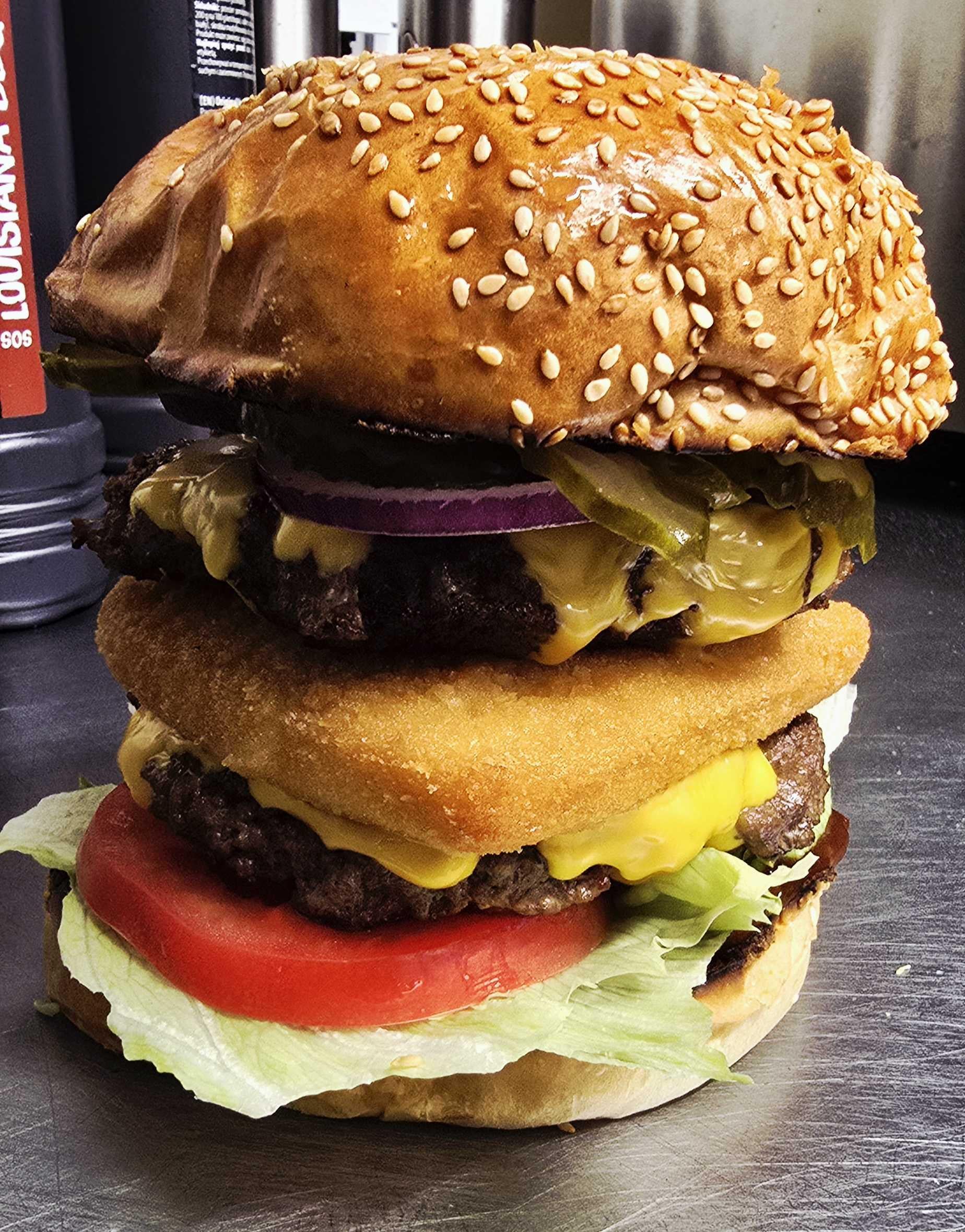 [homemade] Double cheeseburger stacked with onion ring and melted cheddar