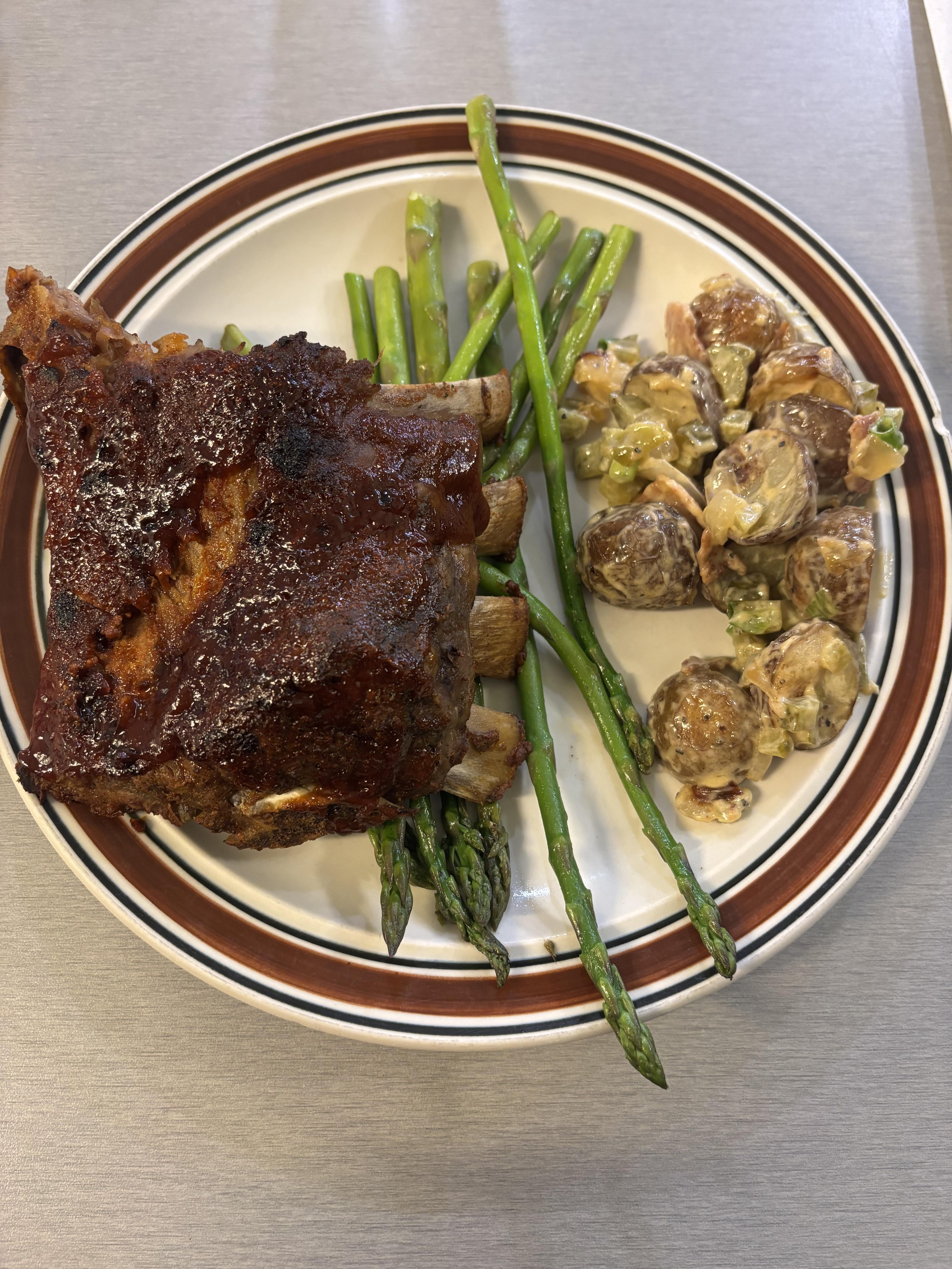Simple yet delicious. Slow roasted pork ribs, roasted potatoes salad and lightly seasoned asparagus. by Non-Linearsequential Dinner Tonight Tonight's Dinner