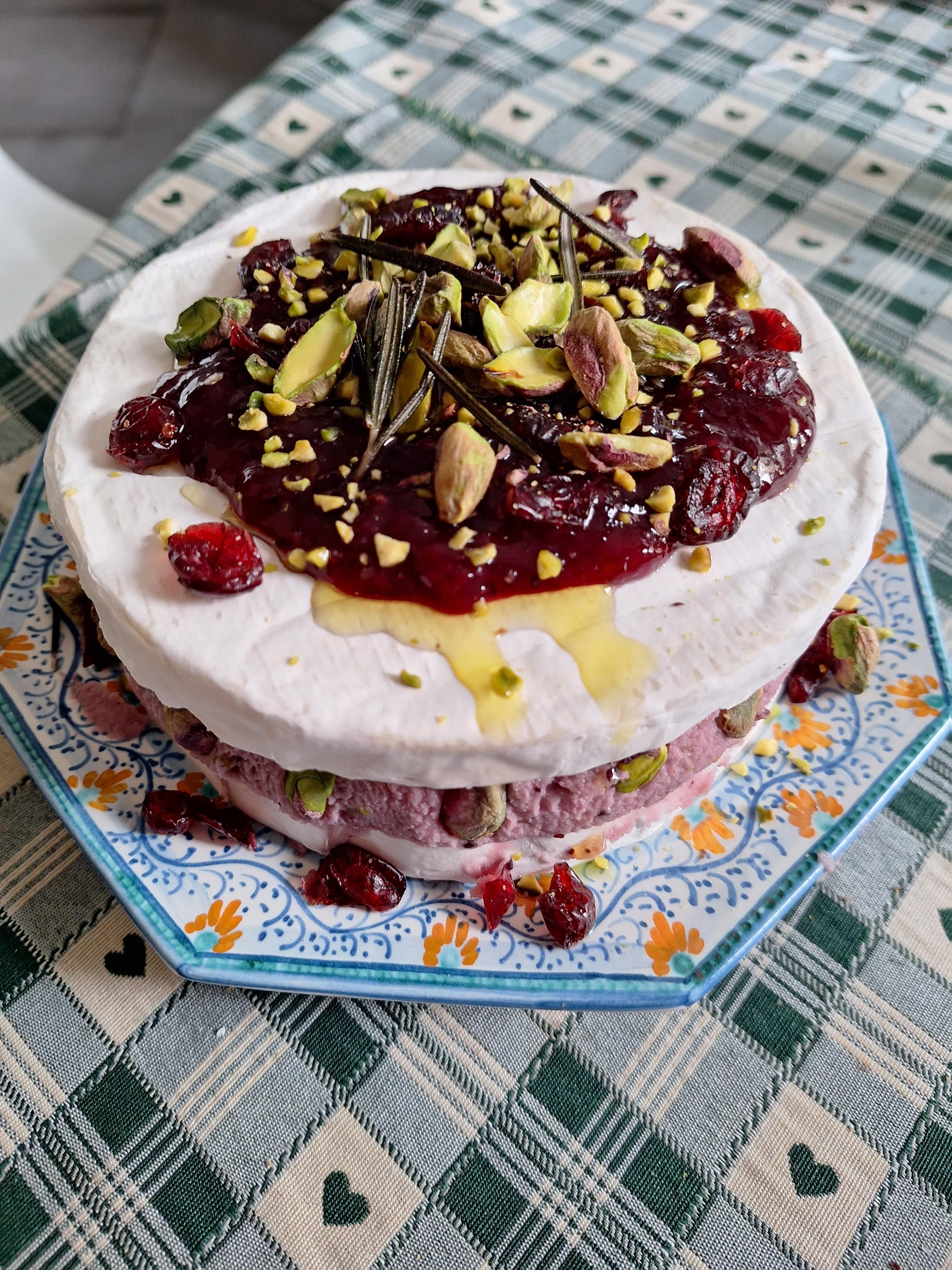 Brie stuffed with mascarpone, red berries jam and pistachio