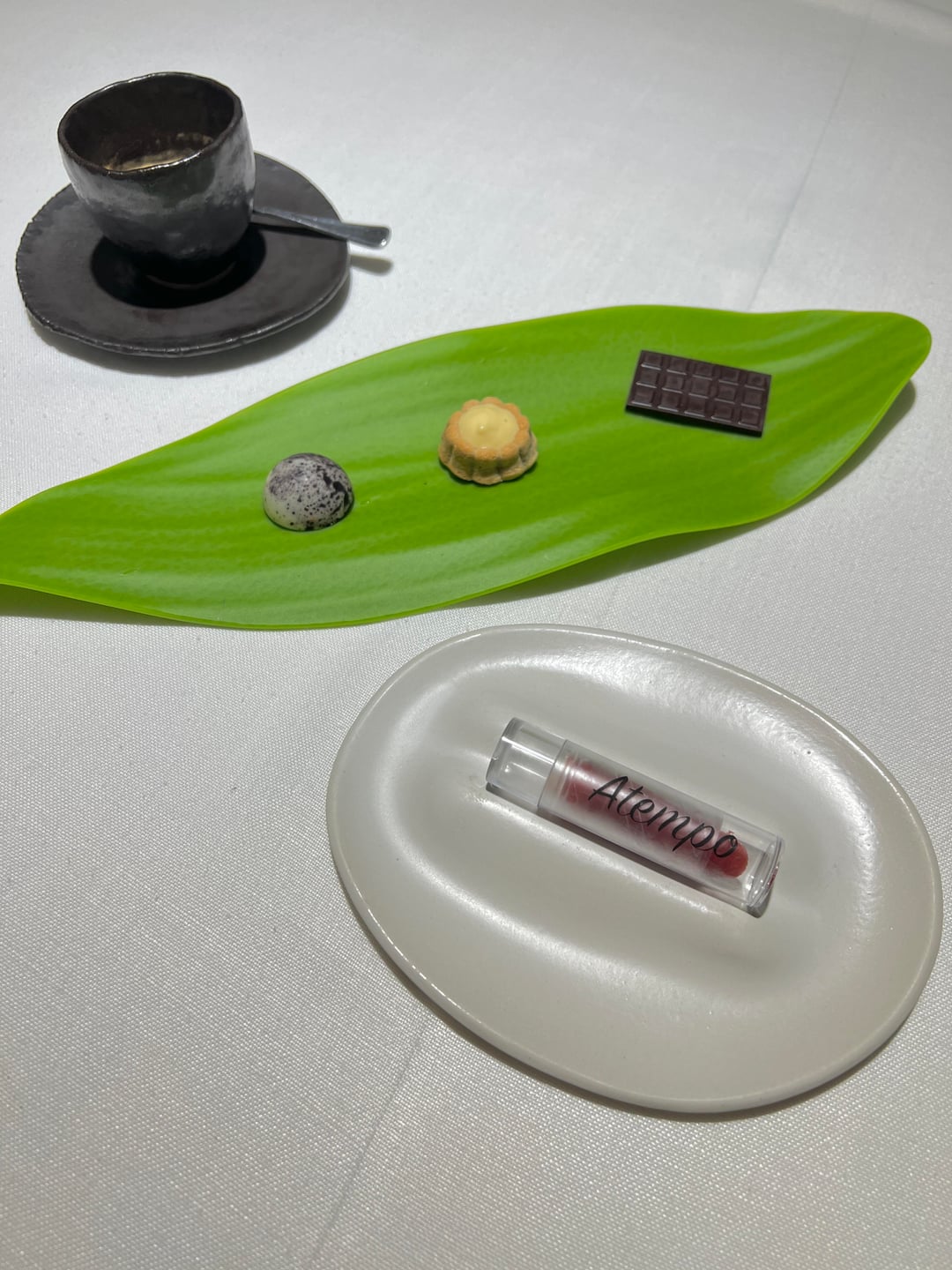 Lastly it was petit fours. Chocolate bar, chestnut tart, white chocolate lavender Bon bon, and a strawberry popsicle lipstick. All excellent.