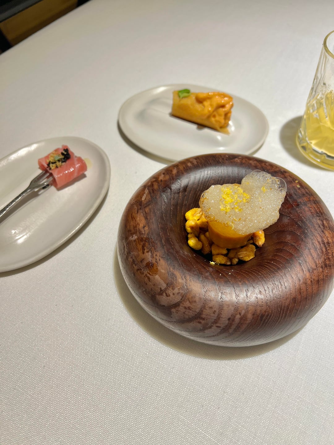 Booked a last minute table at Atempo for lunch and was not disappointed. This is from their La Carta menu. I forgot that places like this include a few (or seven) appetizers so I over ordered a bit. They start you off with 3 small bites and a drink: koji-cured tuna, a corn tartlet with garlic foam, and some sort of crispy cylinder thing with a red pepper and cheese espuma. The drink was a reimagined non-alcoholic Bloody Mary. Each item was delightful.