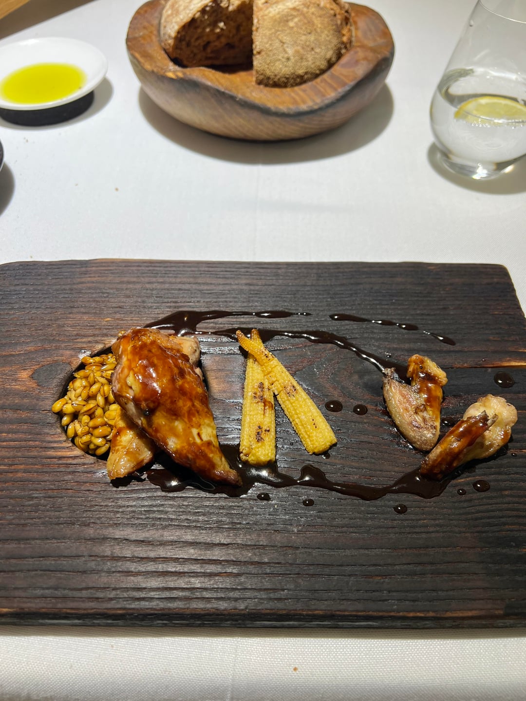 Next up was a warm appetizer: a steamed bao bun filled with iberico pork charsiu and topped with some sort of hoisin citrus sauce. They brought my bread supplement at the same time. It was served with quite possibly the best olive oil I’ve ever had in my life.