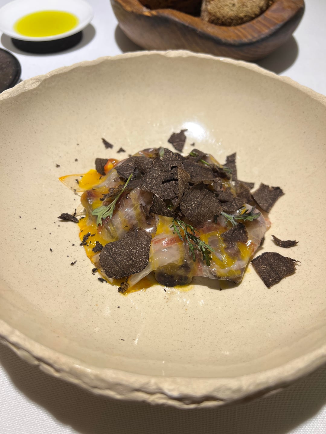 After the bread came the milk cap mushroom starter. It’s composed of smoked milk caps, thinly shaved guanciale, and topped with shaved black truffle. It was delicious but quite a large dish for a starter.
