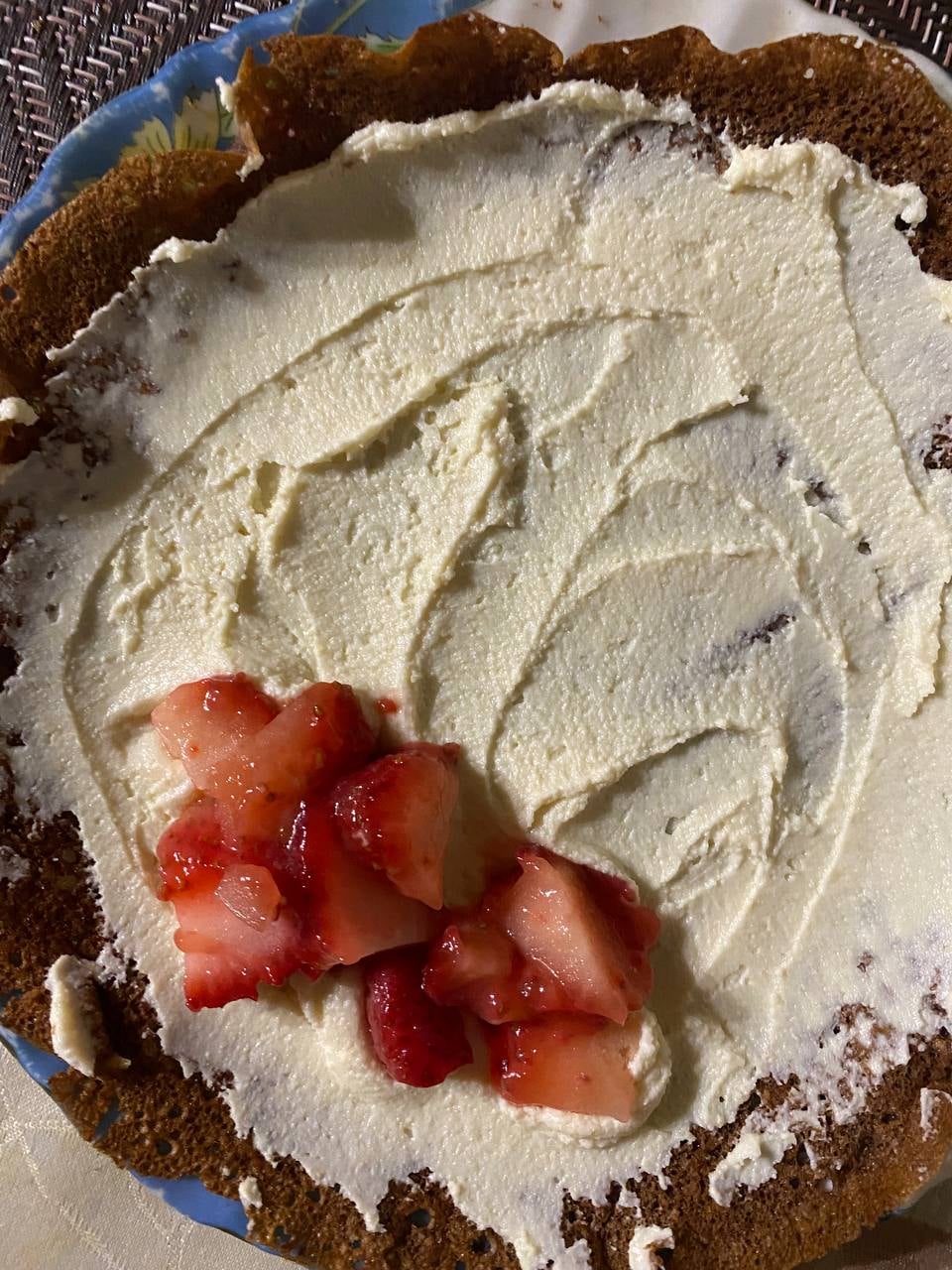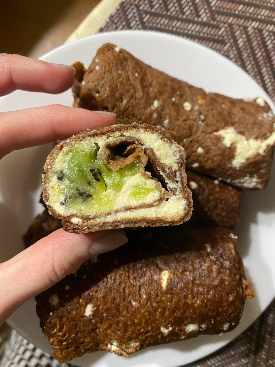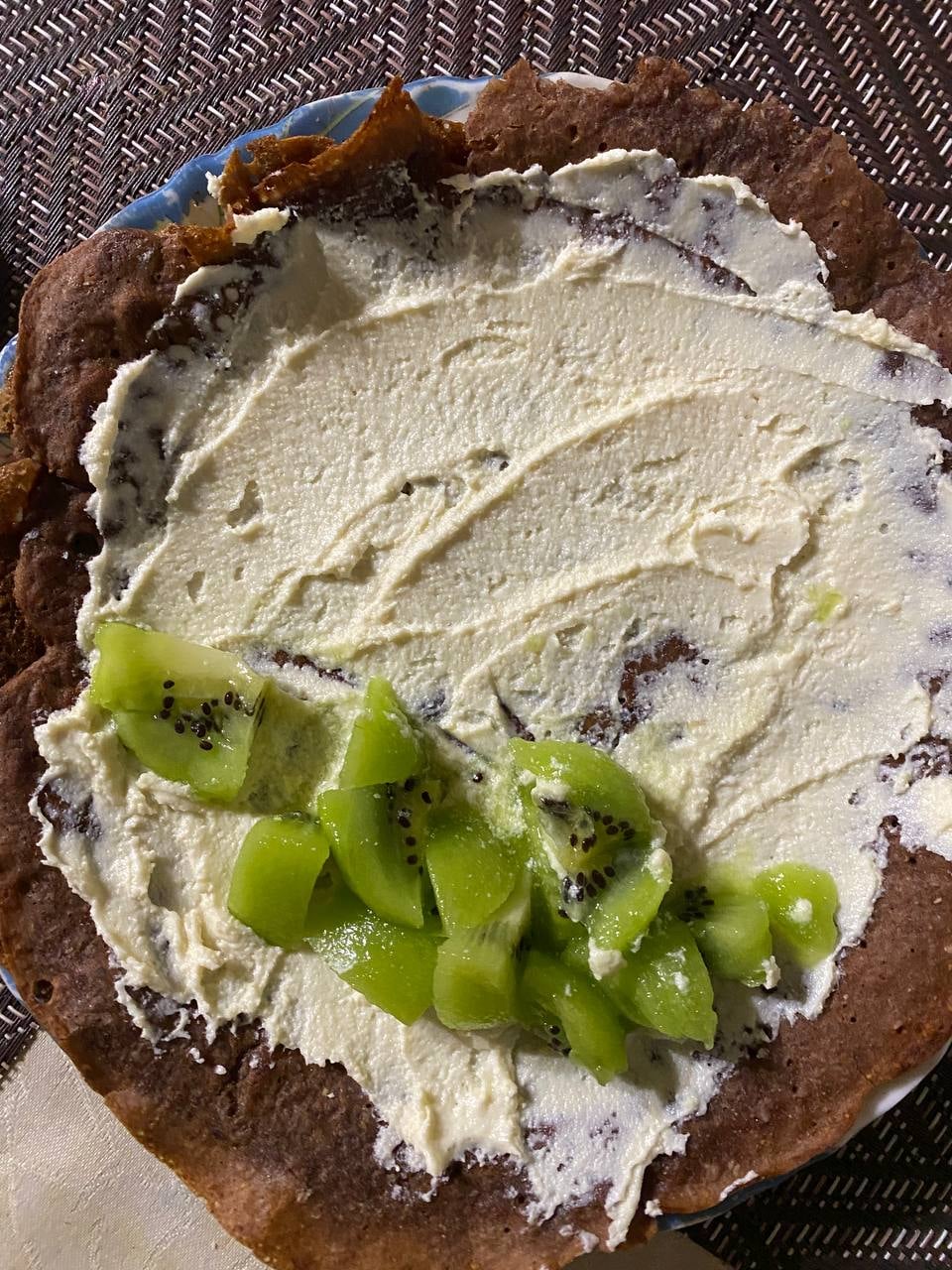 Spread the cream on the pancakes, add chopped fruit, and roll them up.