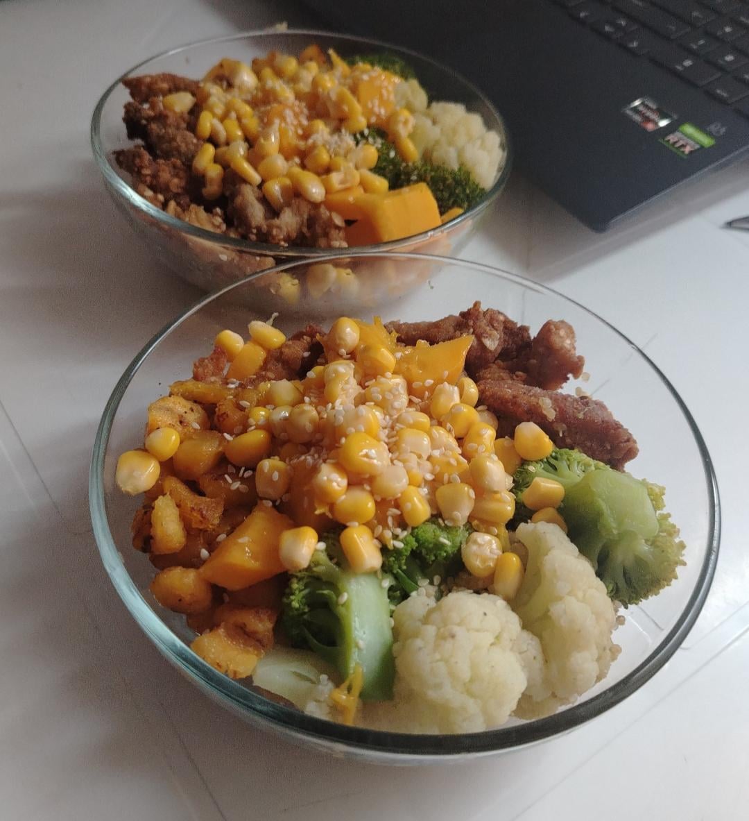 Ok, I don’t care what they say but this is delicious, Quinoa base, crispy pork, veggies, diced ripe plantain and corn by gemmaintheworld Dinner Tonight Tonight's Dinner
