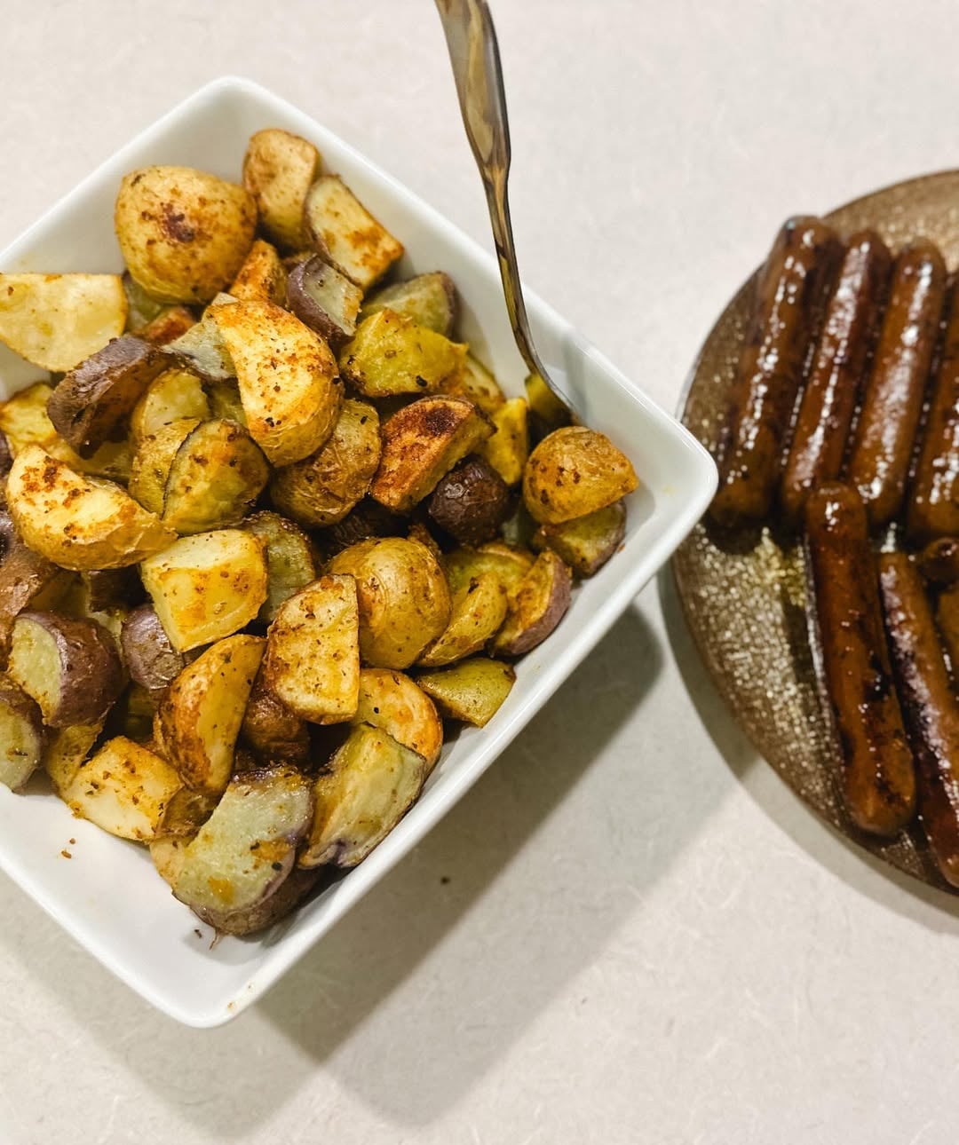 – Roasted seasoned potatoes and apple maple sausages glazed in maple syrup 🍁