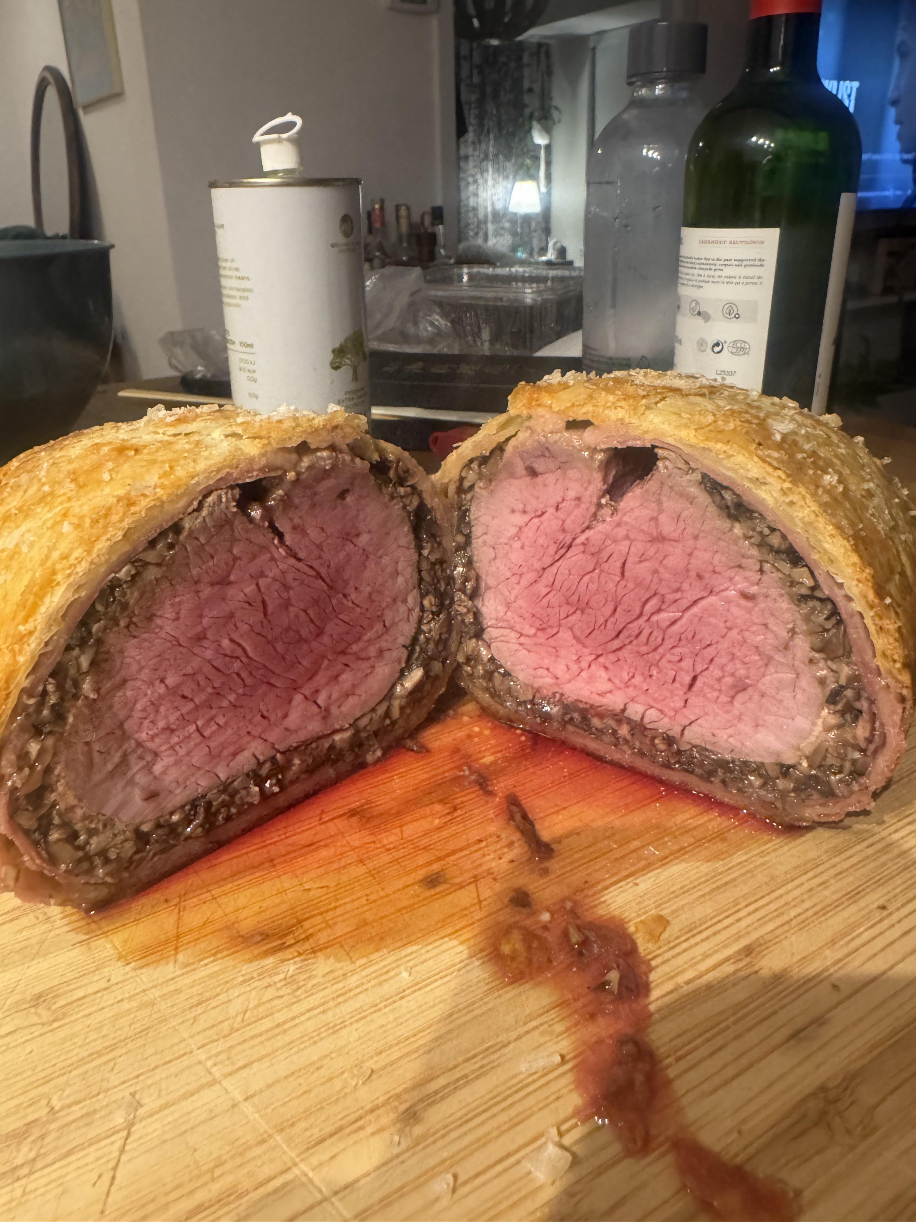 First try! Meat was a touch over and I sliced it a couple mins too soon because I was so excited but I popped it on a rack so it didn’t bleed out all over the pastry and make it soggy. Fuckin slapped! by wetwilly2140 Food