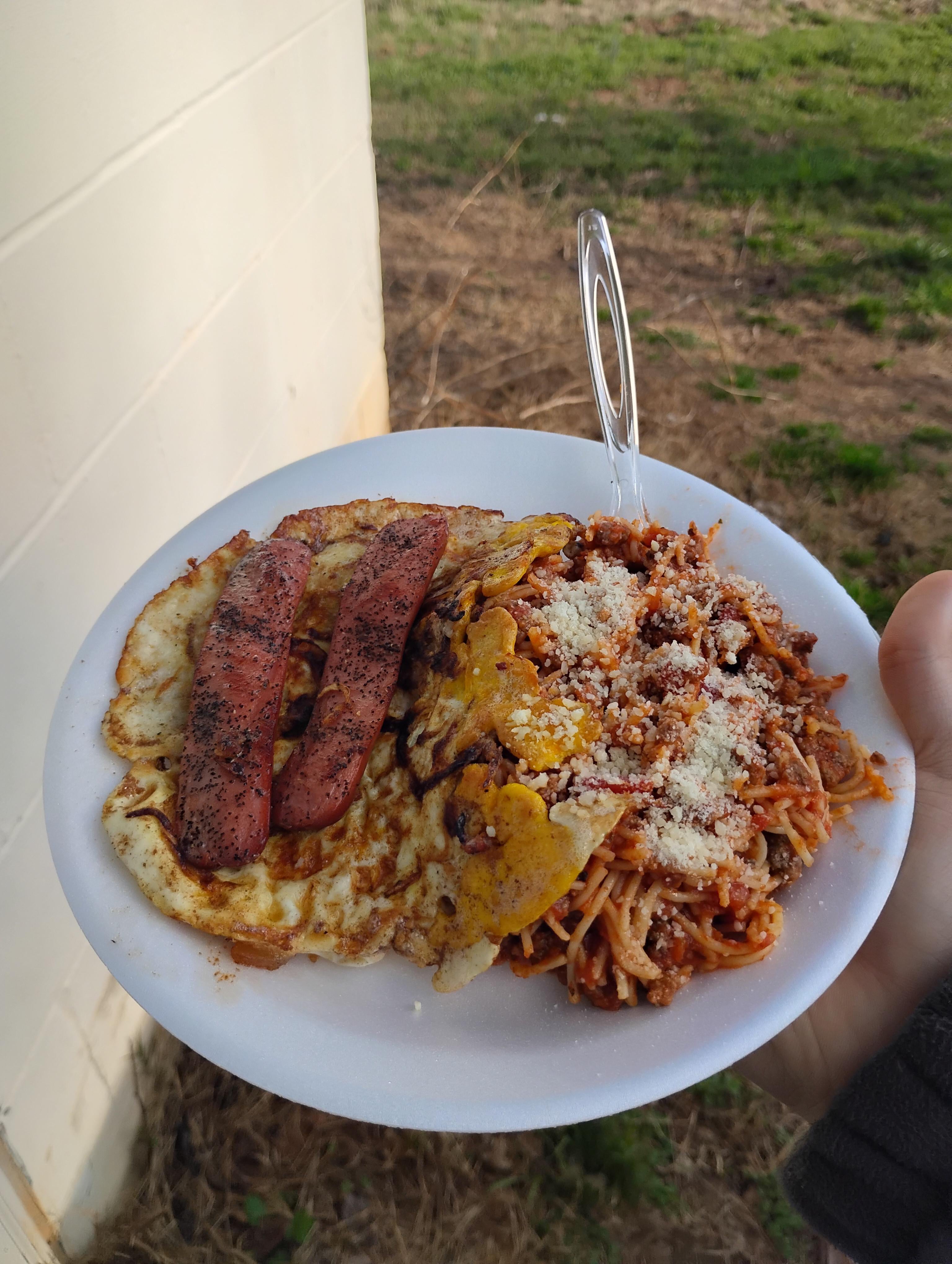 Spaghetti, a fried egg, and and a fried, cut-in-half hotdog, thrown together from the week's leftovers. Turned out pretty good. 😺 by The_Kr0w7 Food
