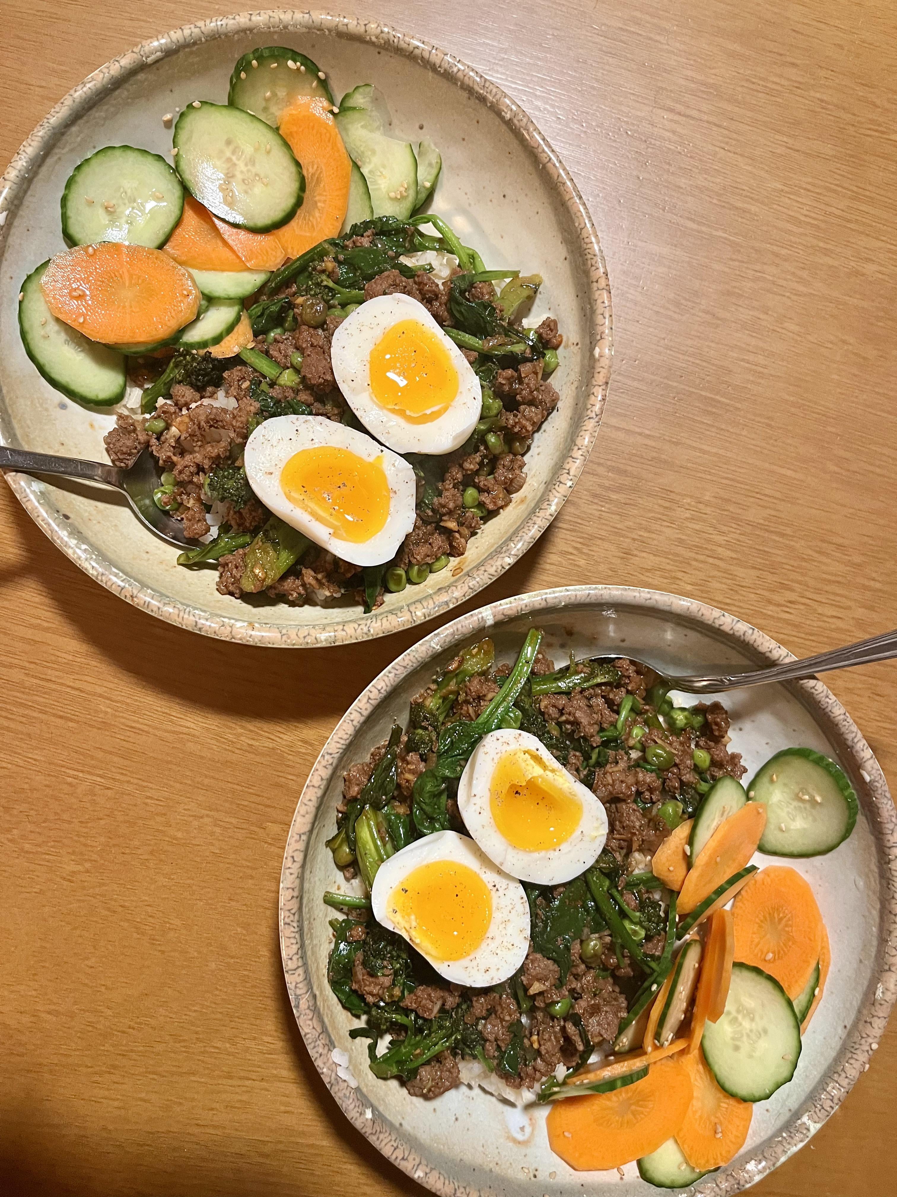 Thai basil beef stir fry over brown rice with quick-pickled veg and a soft-boiled egg by Cooking-Marsupial Dinner Tonight Tonight's Dinner